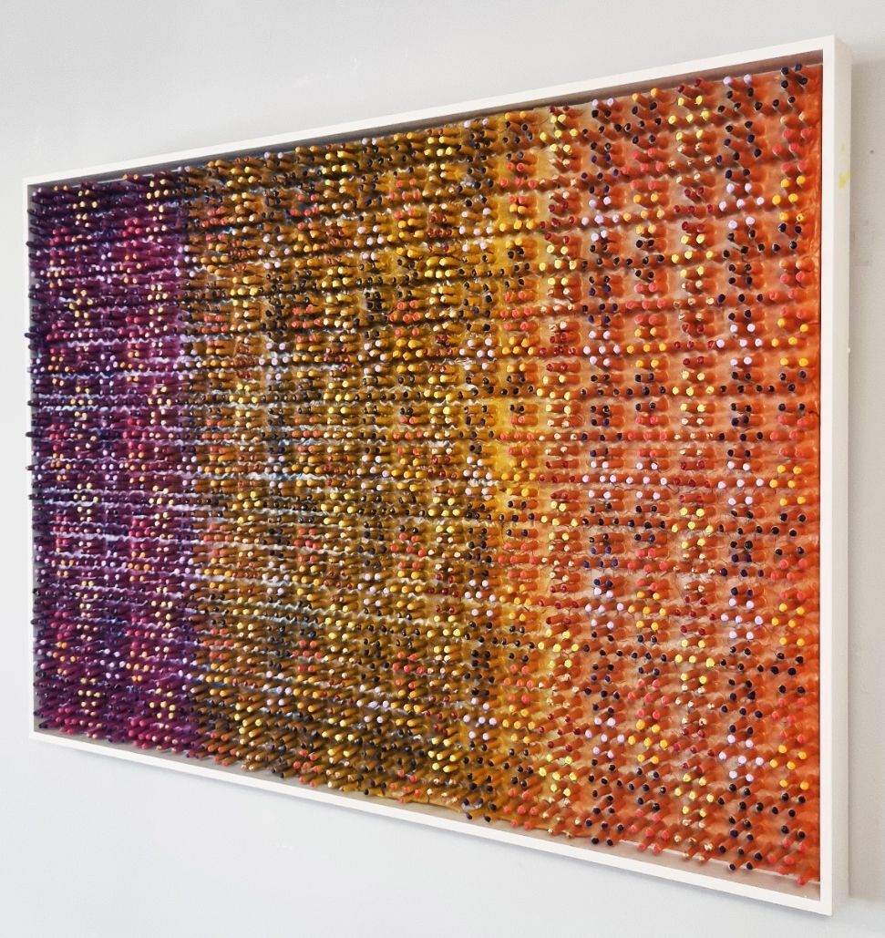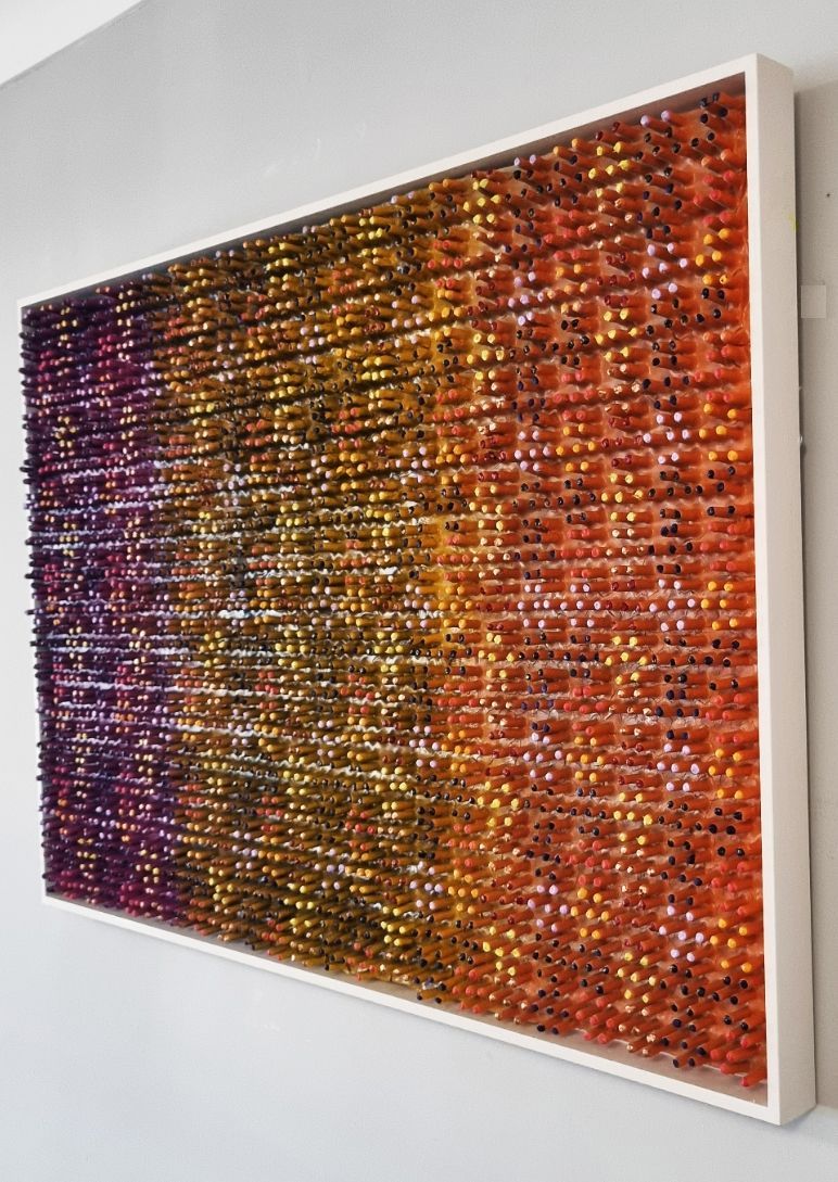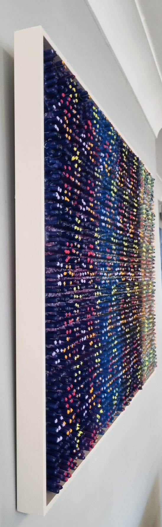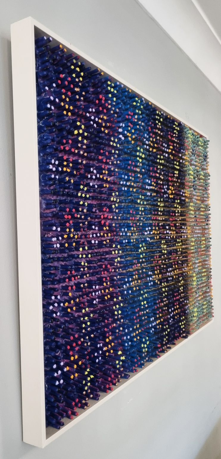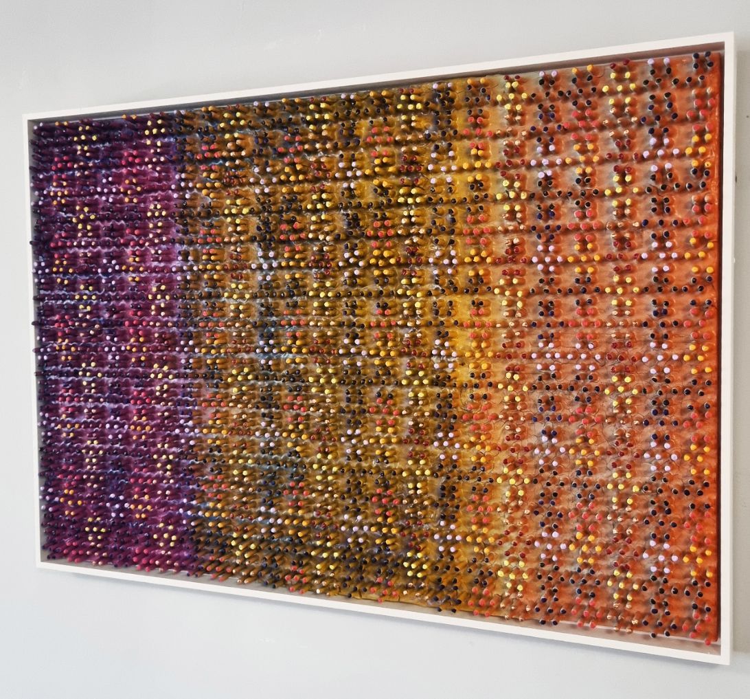 A 3D creation which changes colour when moving past. The artwork has been created using a thick layer of emulsion and plaster to form a fractured based from which shoots have grown into a hexagonal formation to form and organic circuit board with the numerical electronic display.