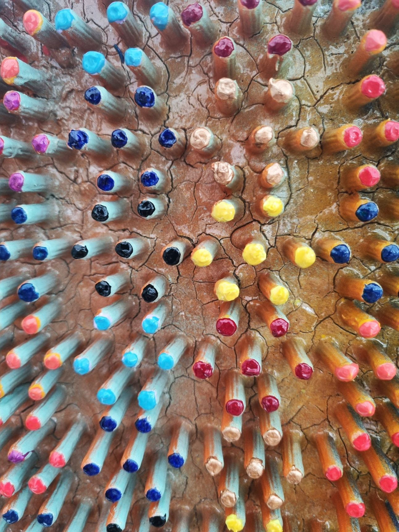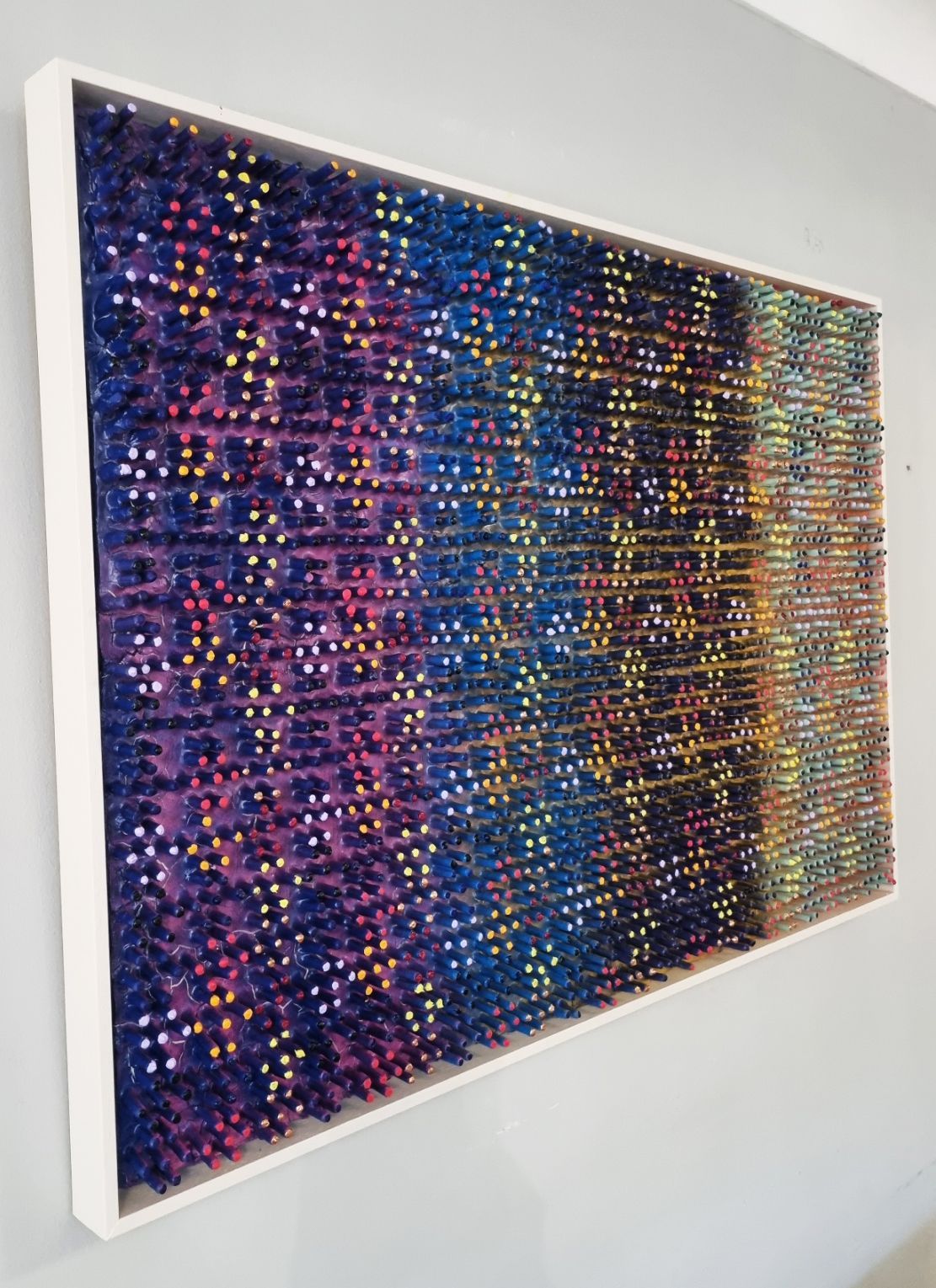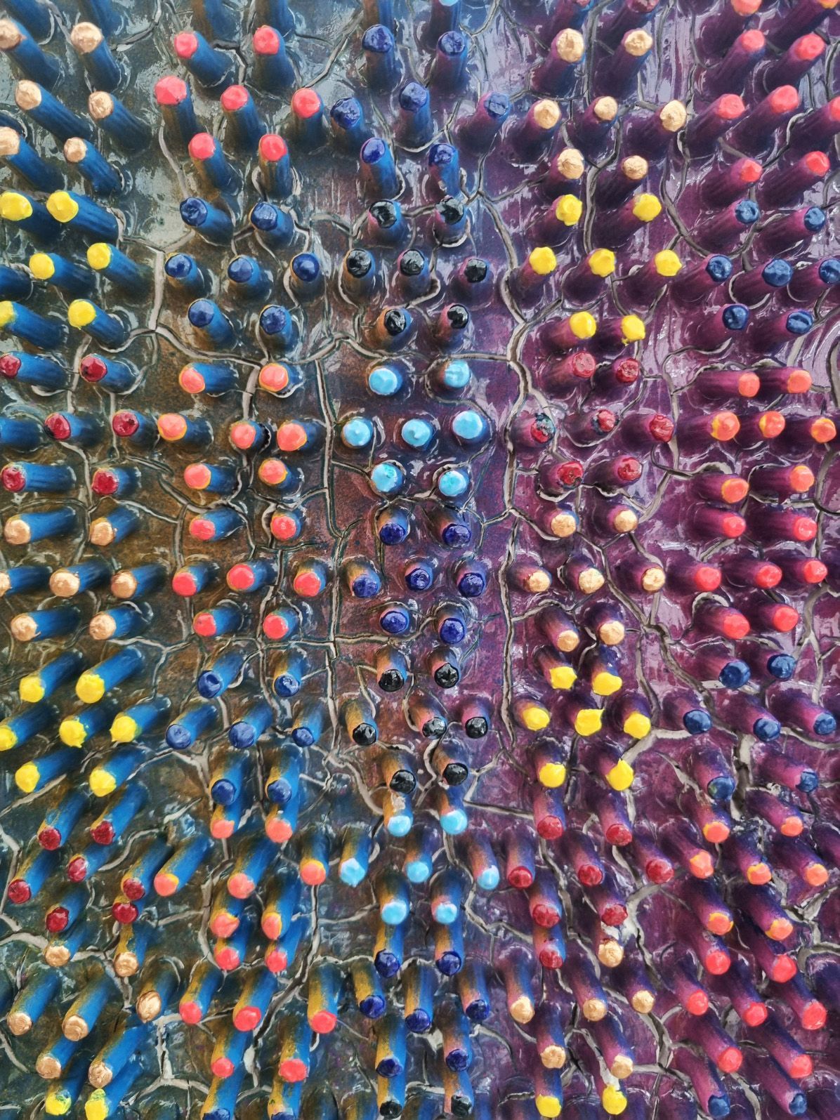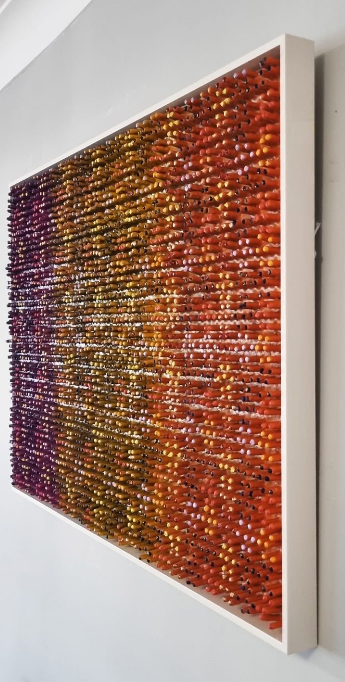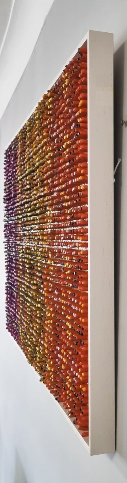A 3D creation which changes colour when moving past. The artwork has been created using a thick layer of emulsion and plaster to form a fractured based from which shoots have grown into a hexagonal formation to form and organic circuit board with the numerical electronic display.