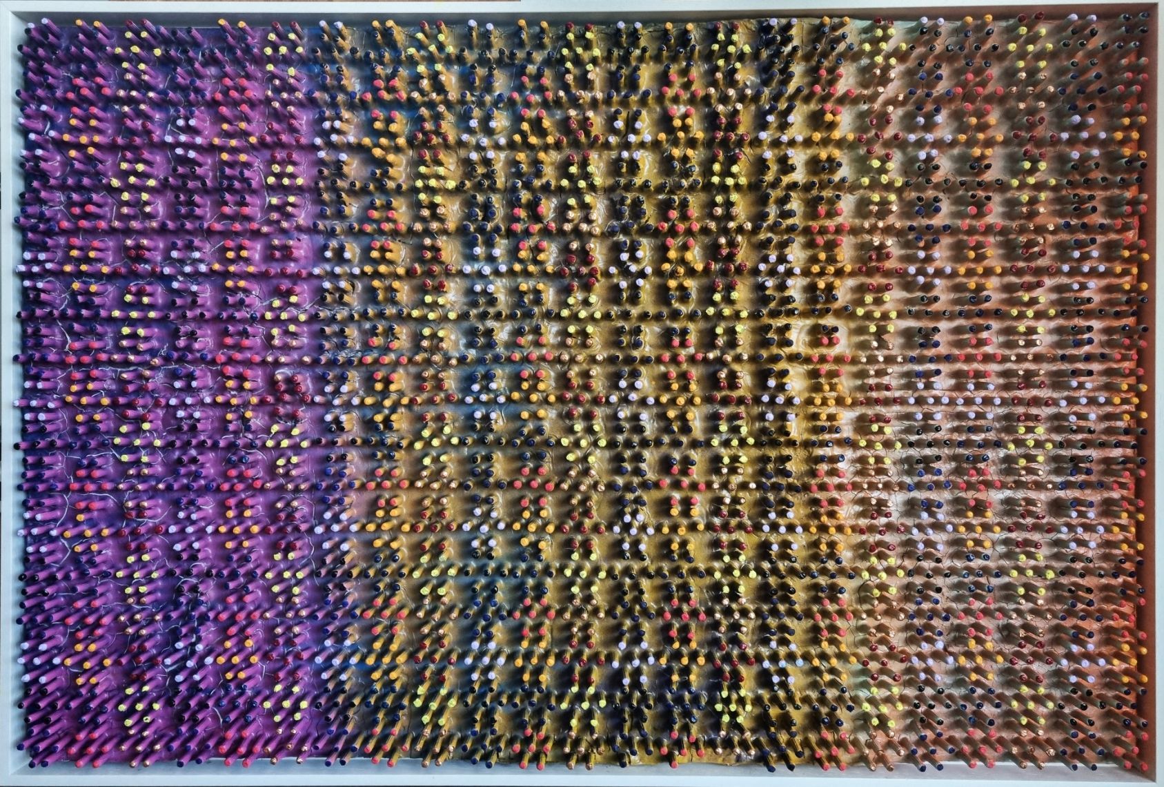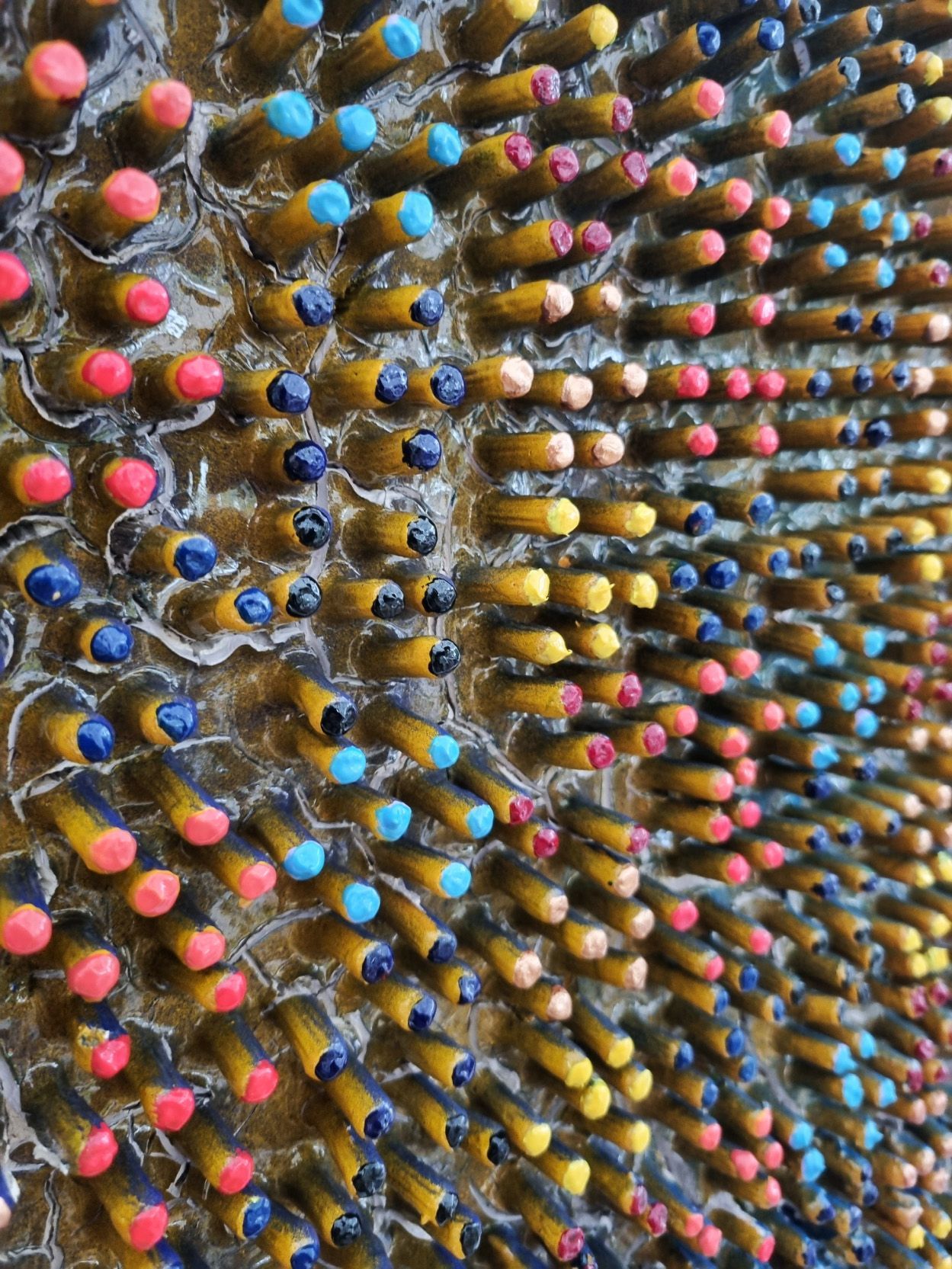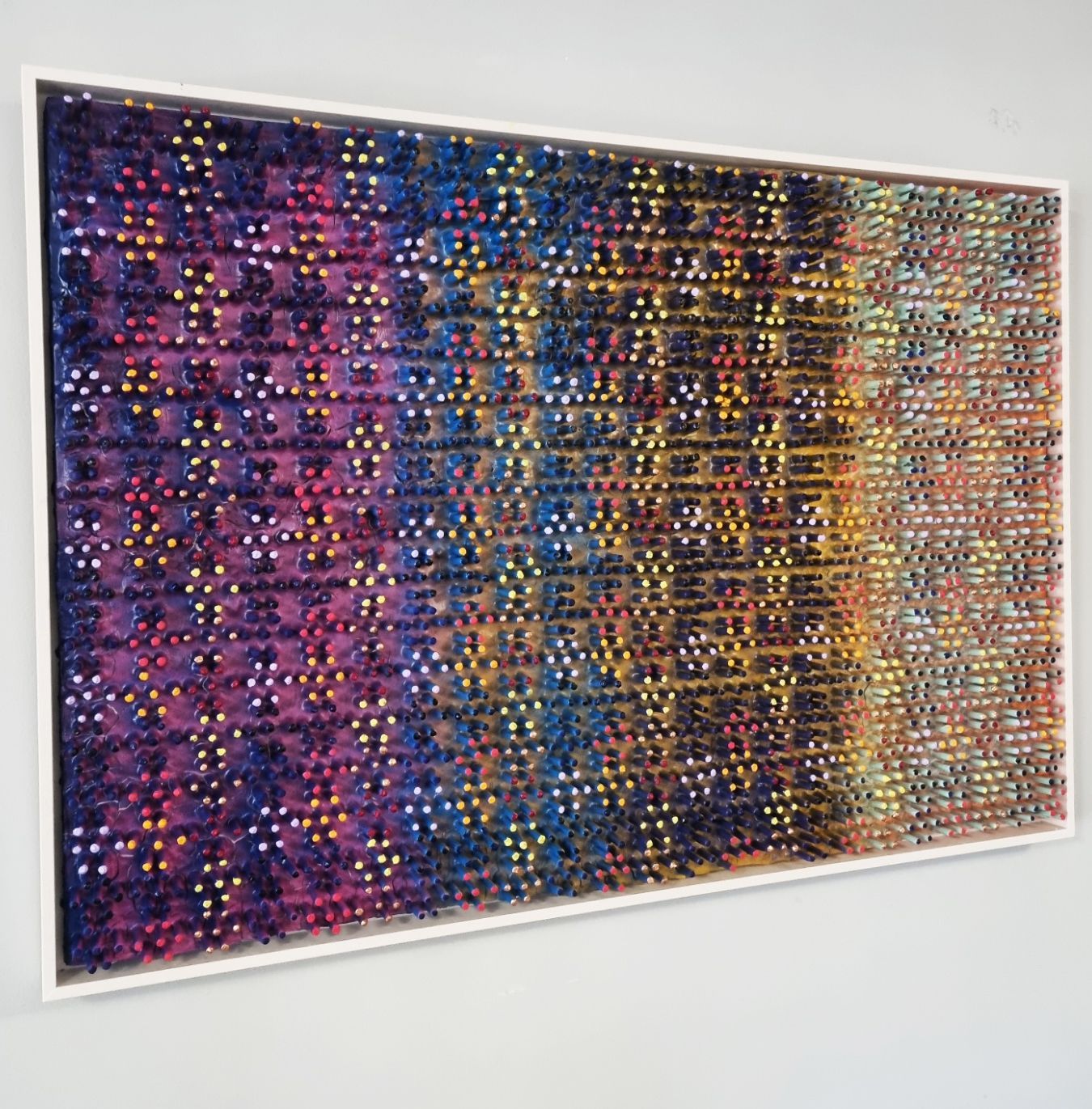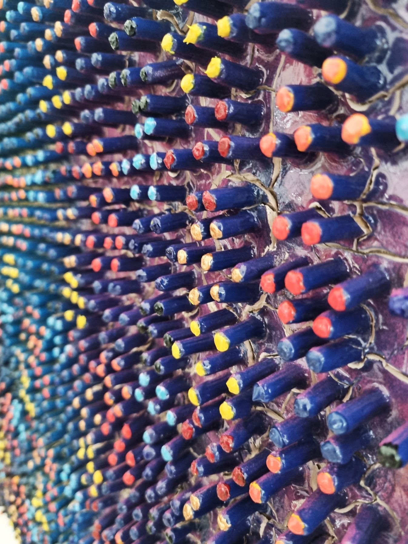 A 3D creation which changes colour when moving past. The artwork has been created using a thick layer of emulsion and plaster to form a fractured based from which shoots have grown into a hexagonal formation to form and organic circuit board with the numerical electronic display.