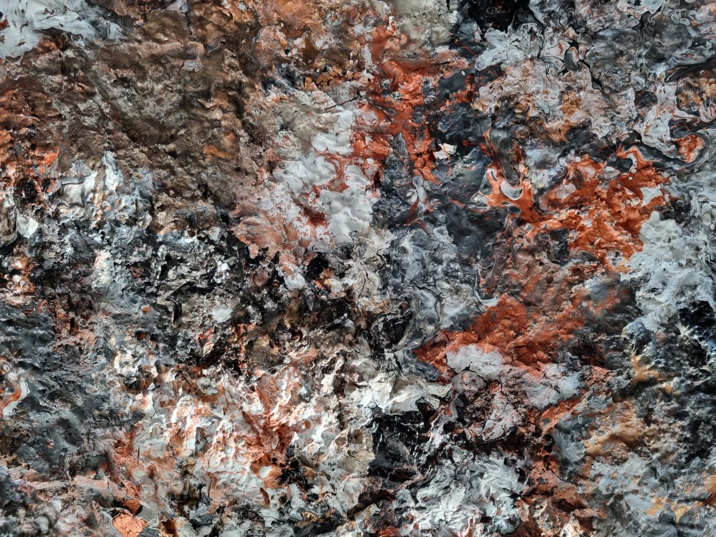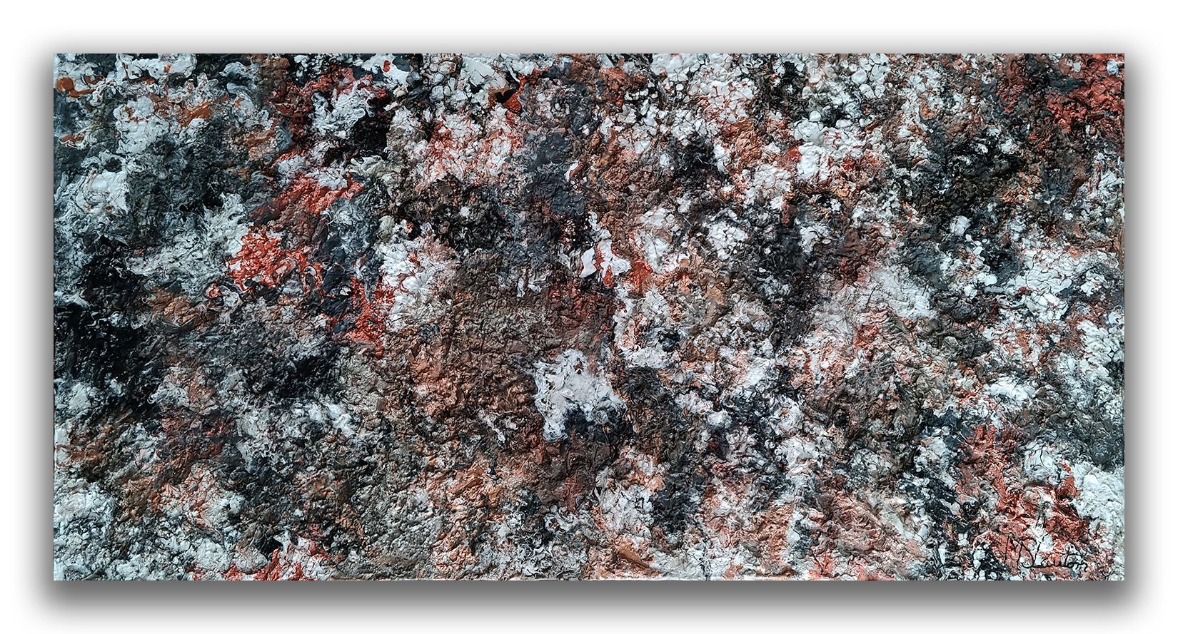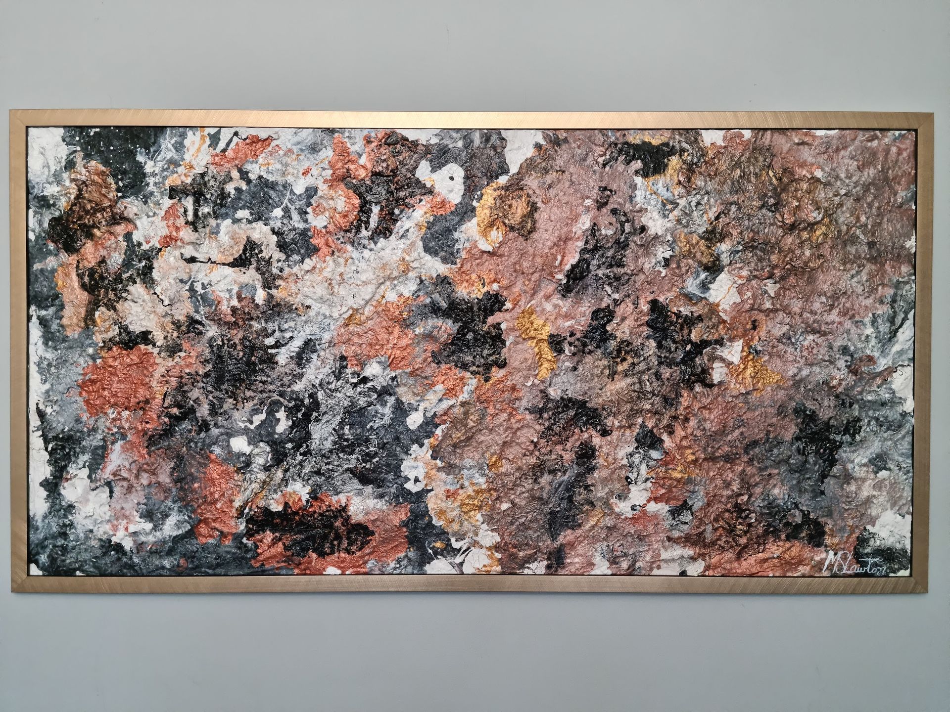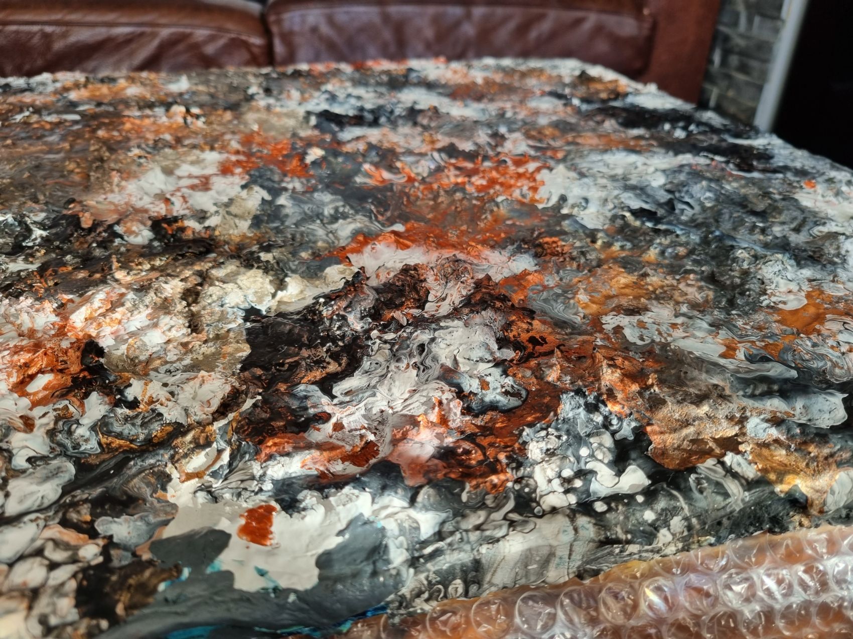 Earth’s Core 2: this artwork is also a contoured base of plaster and emusion paint on top of 12mm board. The top layer is acrylic and a gloss varnish finish. The piece is unframed with brass fixings on the back for horizontal or vertical hanging.