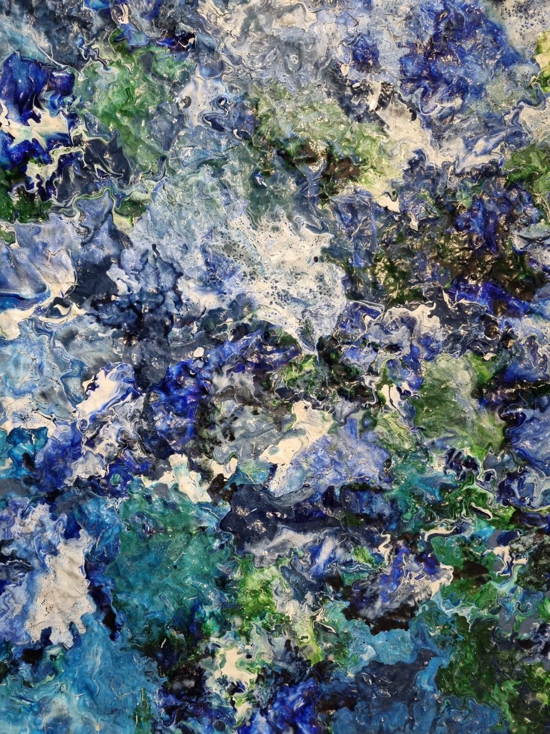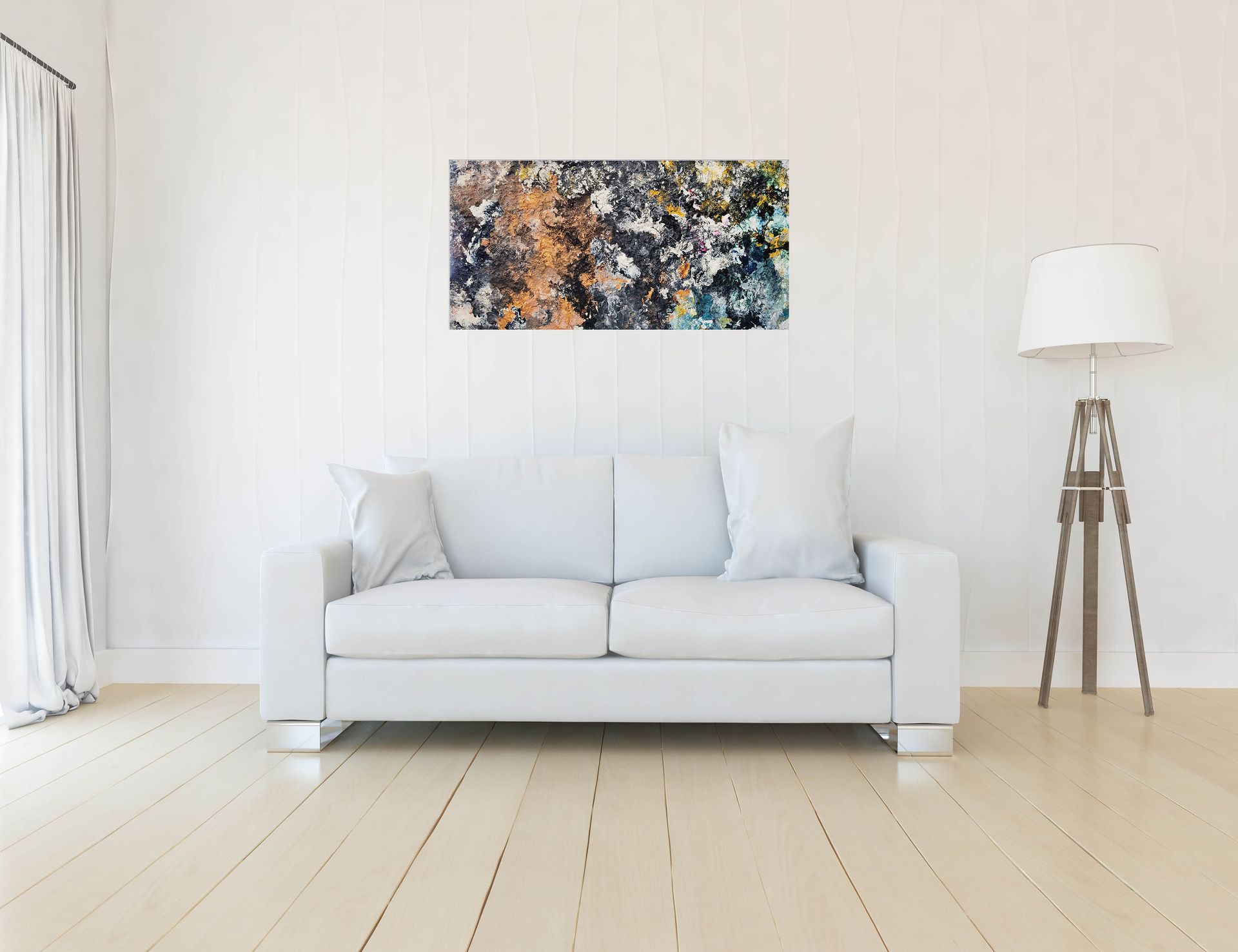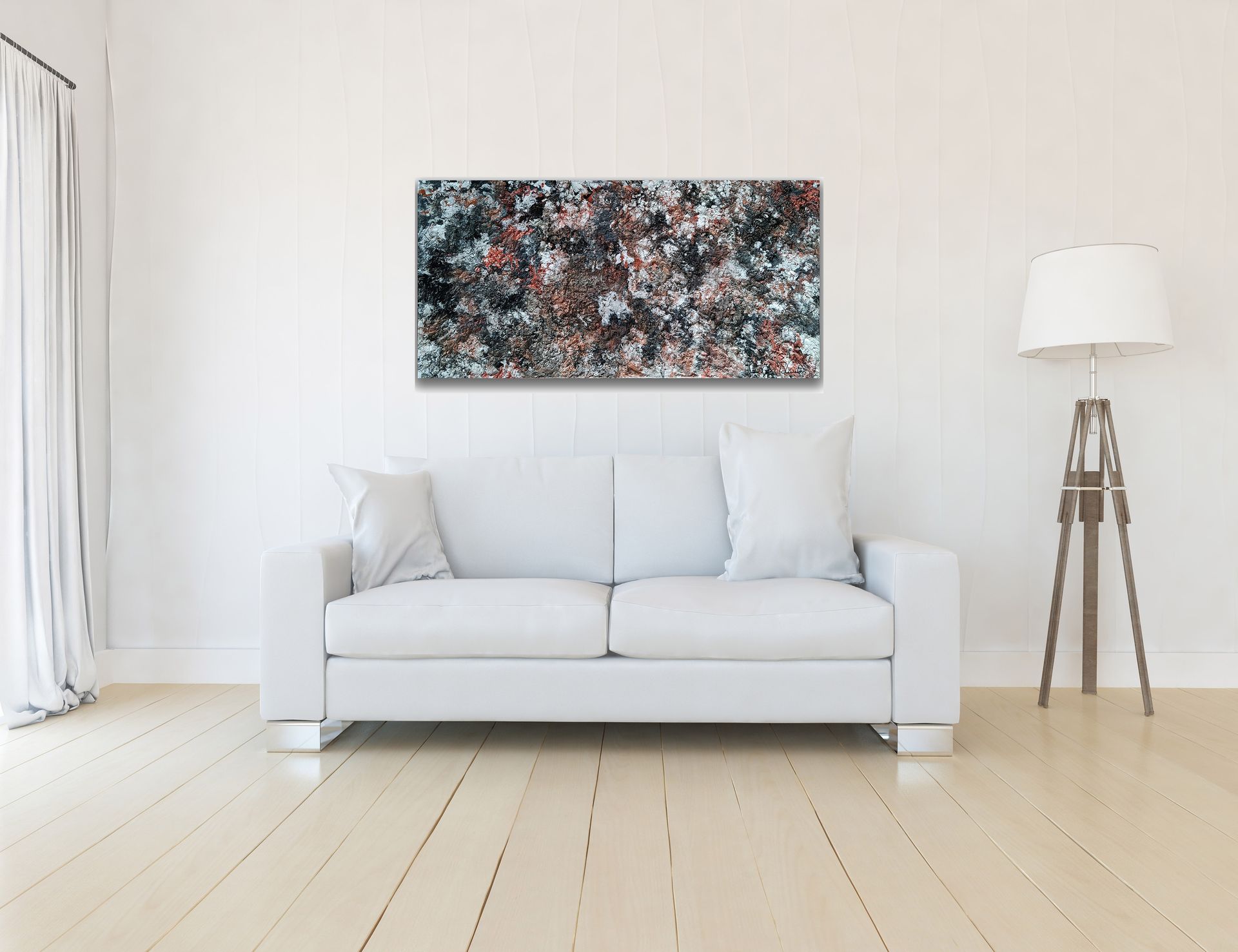 Earth’s Core 2: this artwork is also a contoured base of plaster and emusion paint on top of 12mm board. The top layer is acrylic and a gloss varnish finish. The piece is unframed with brass fixings on the back for horizontal or vertical hanging.
