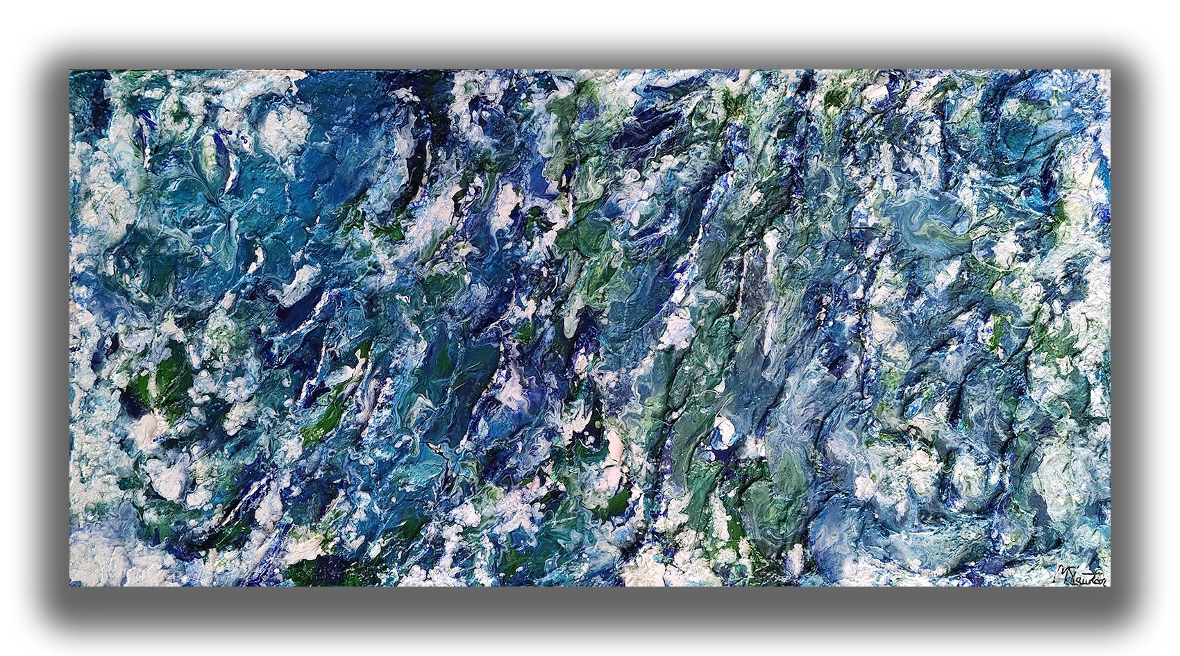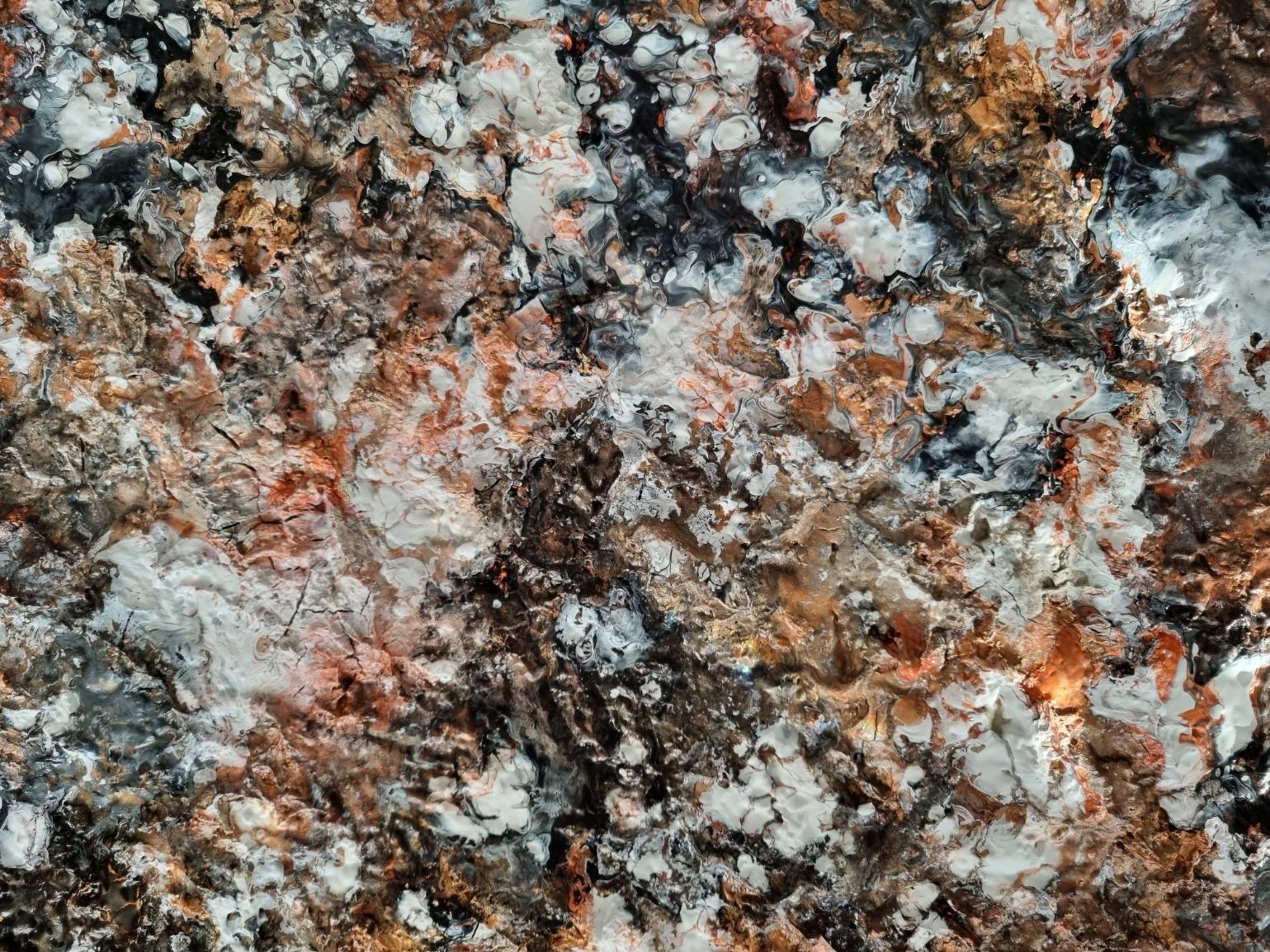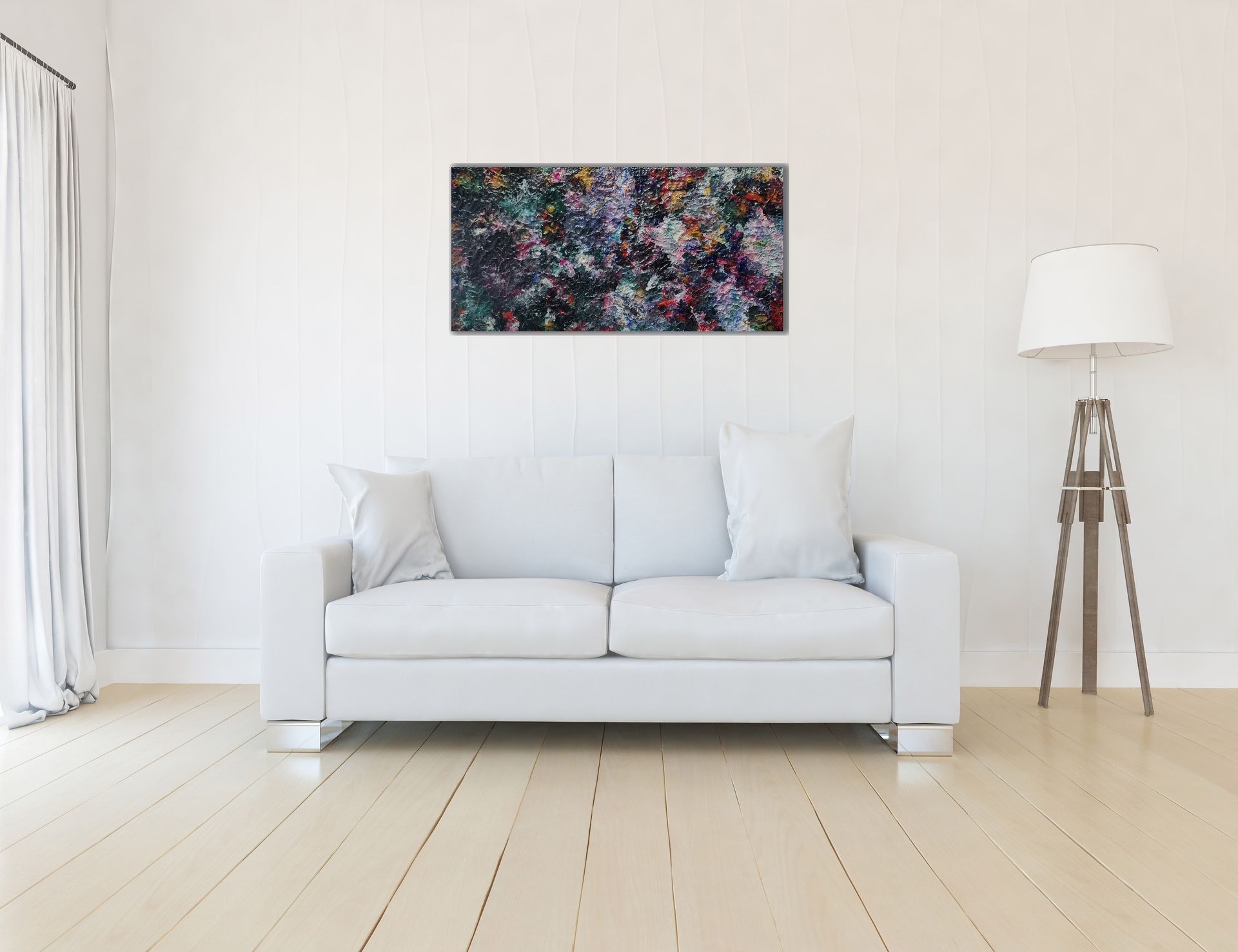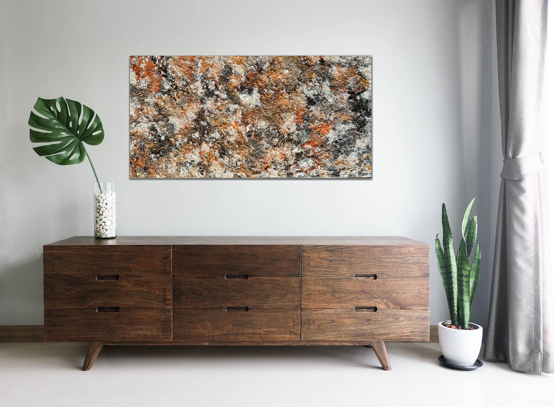 Earth’s Core 2: this artwork is also a contoured base of plaster and emusion paint on top of 12mm board. The top layer is acrylic and a gloss varnish finish. The piece is unframed with brass fixings on the back for horizontal or vertical hanging.