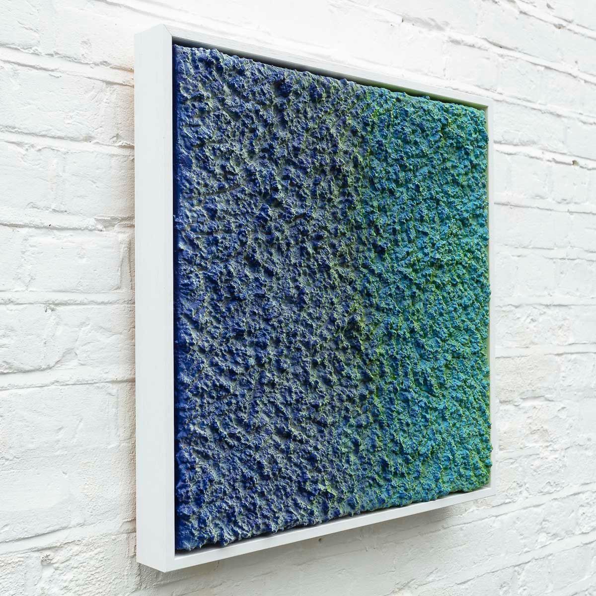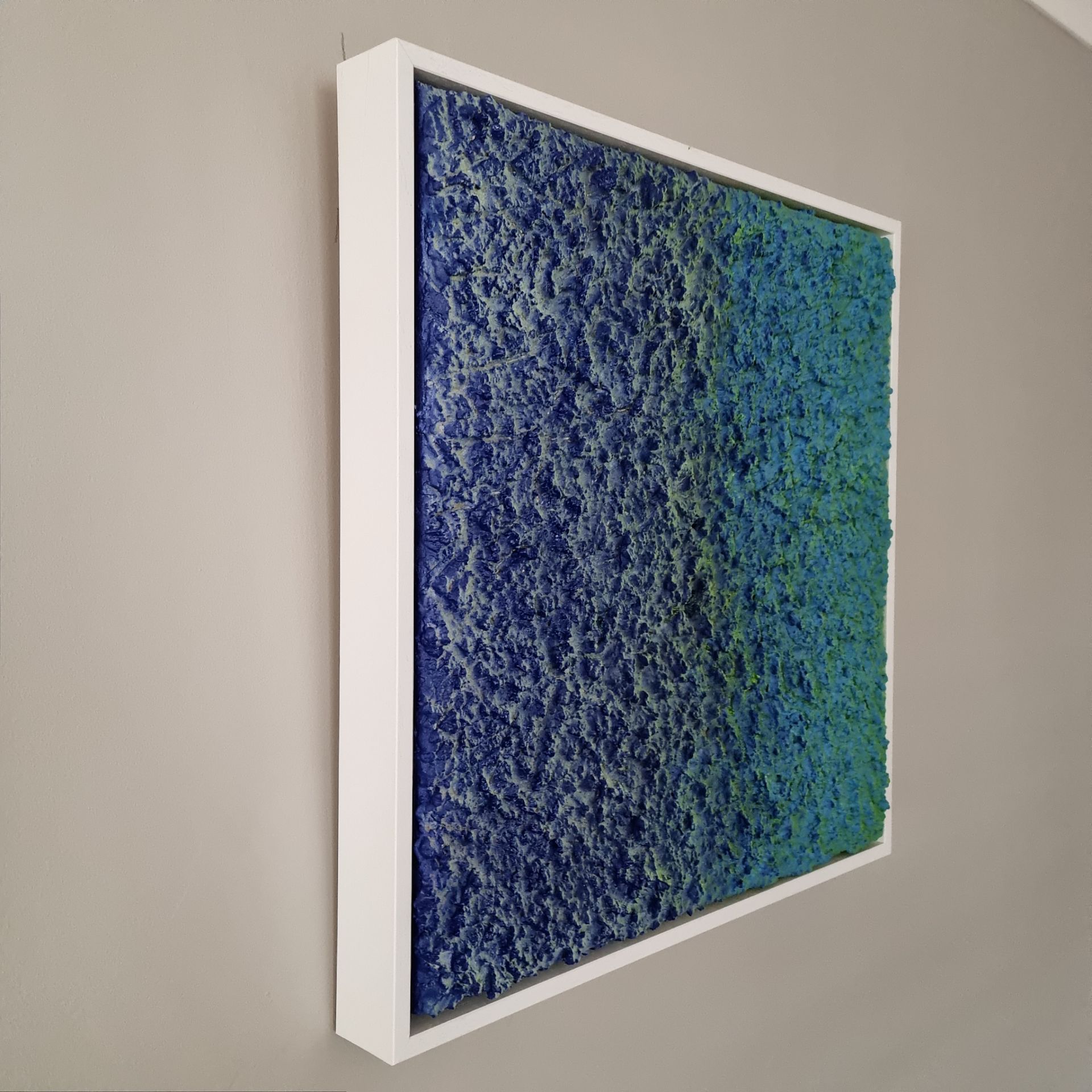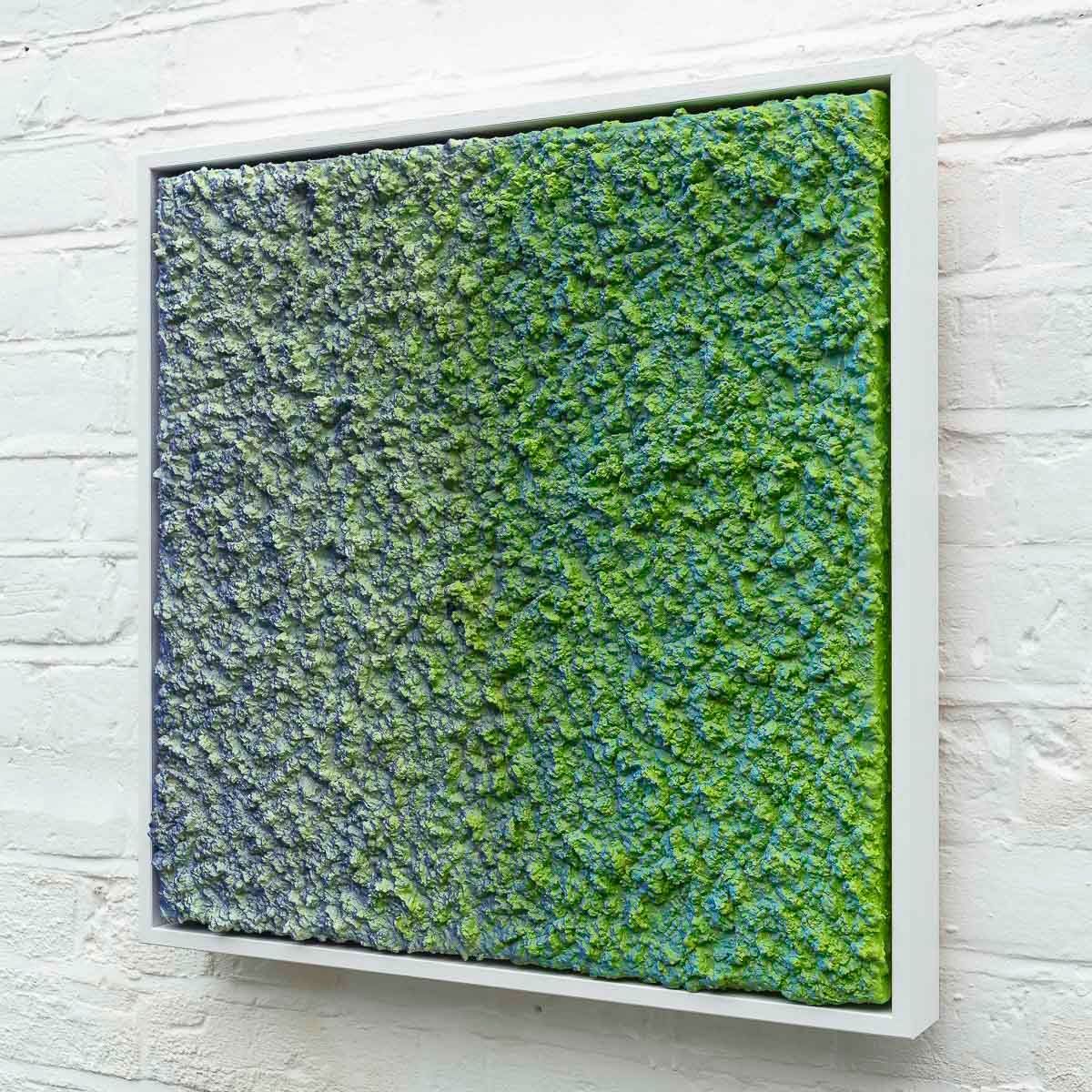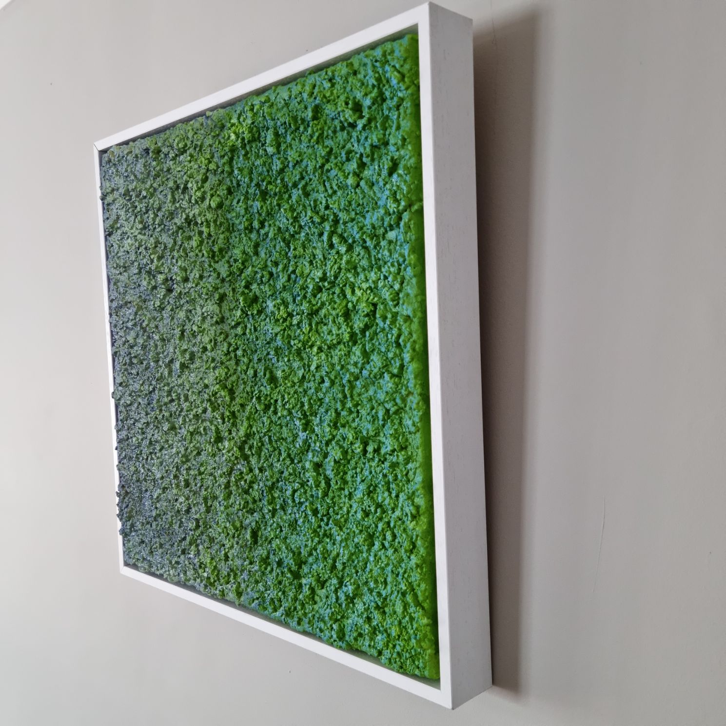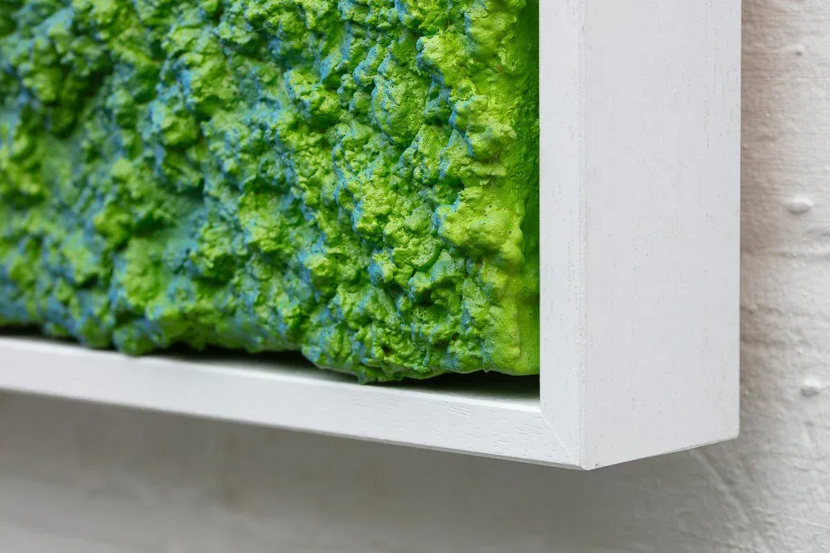 Discover the beauty of Land And Sea. This stunning piece, is elegantly framed in a white wooden tray. The artwork's textured surface and vibrant green hues evoke the serene harmony between land and sea, making it a perfect addition to any modern space.