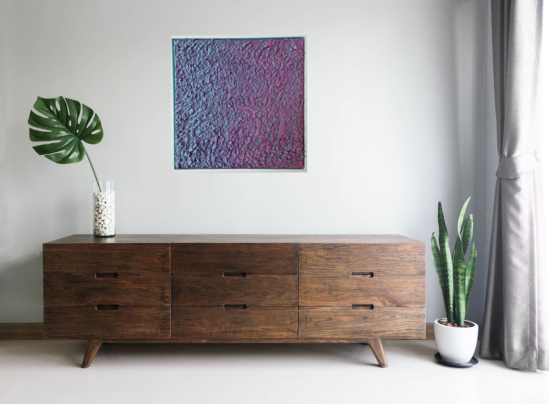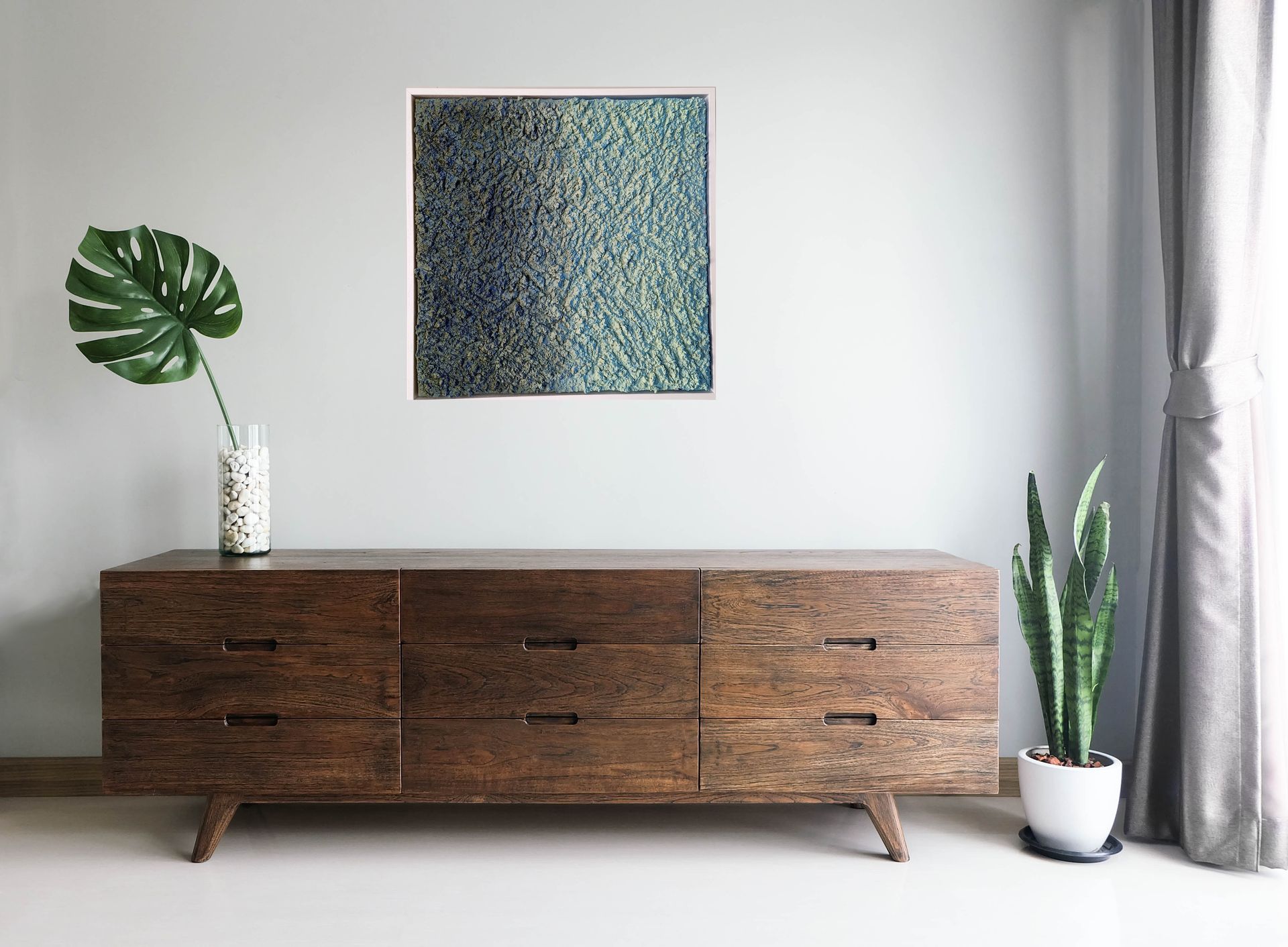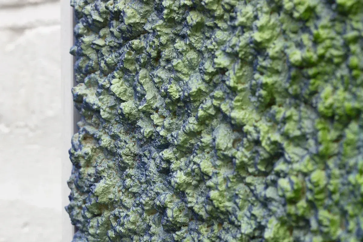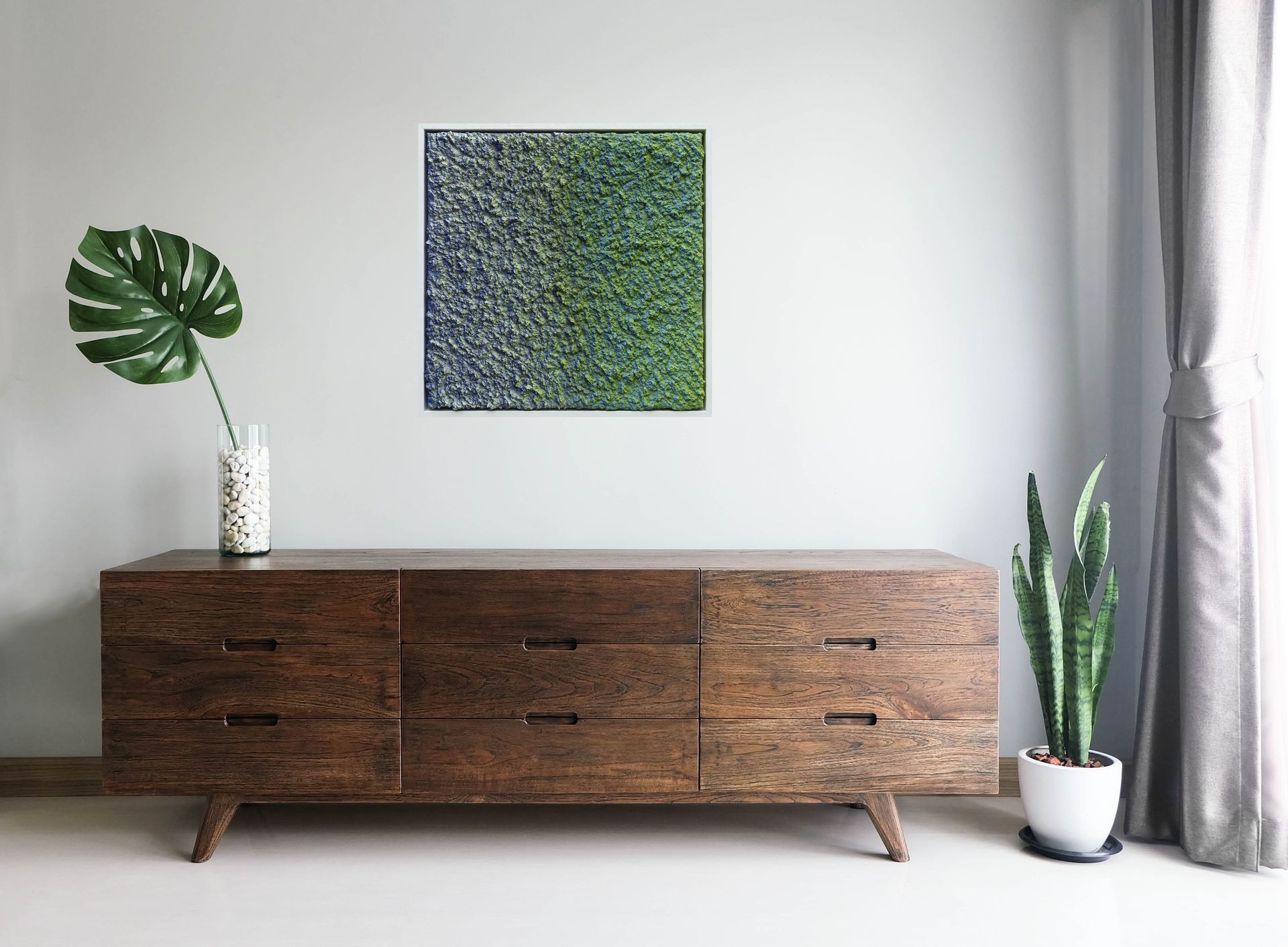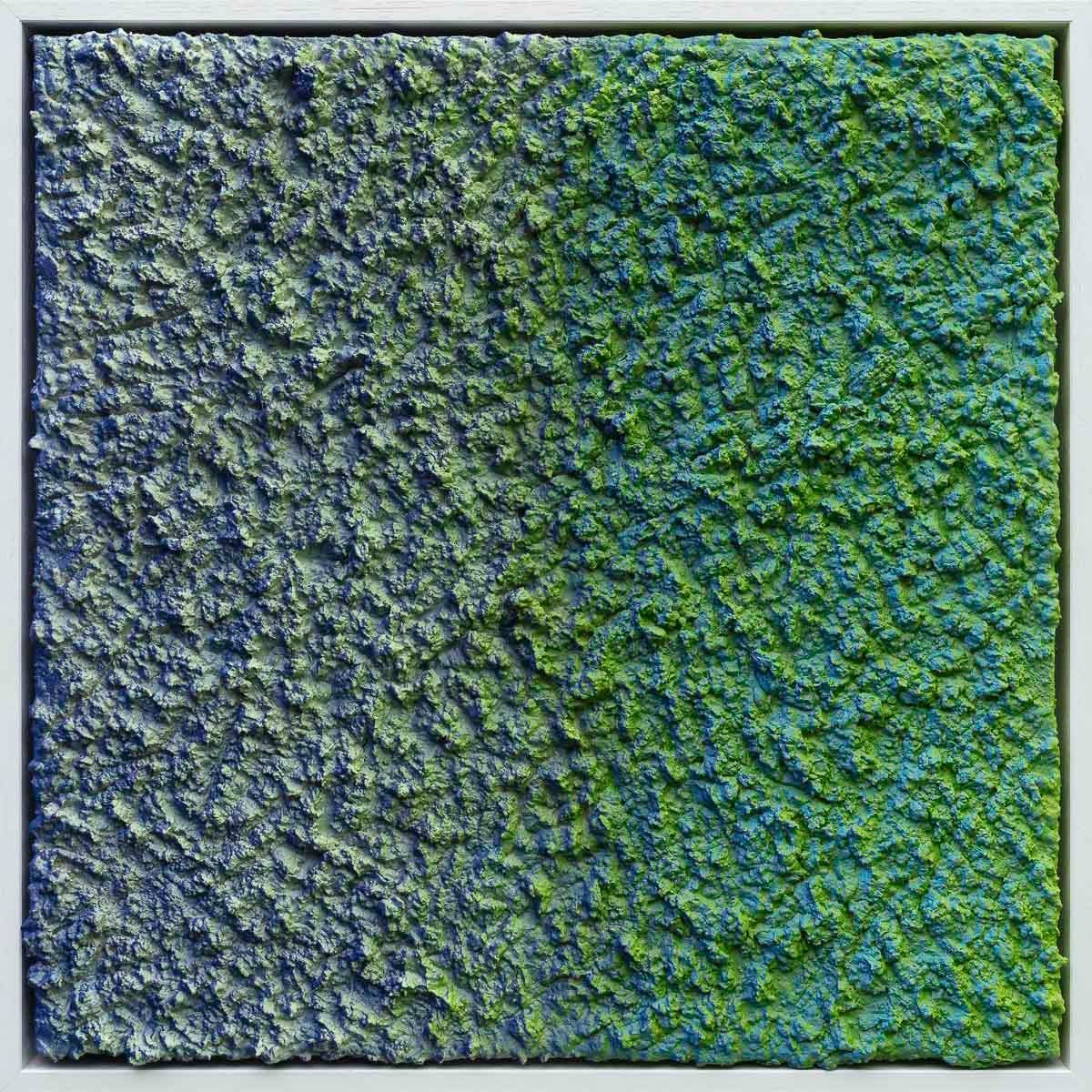 Discover the beauty of Land And Sea. This stunning piece, is elegantly framed in a white wooden tray. The artwork's textured surface and vibrant green hues evoke the serene harmony between land and sea, making it a perfect addition to any modern space.