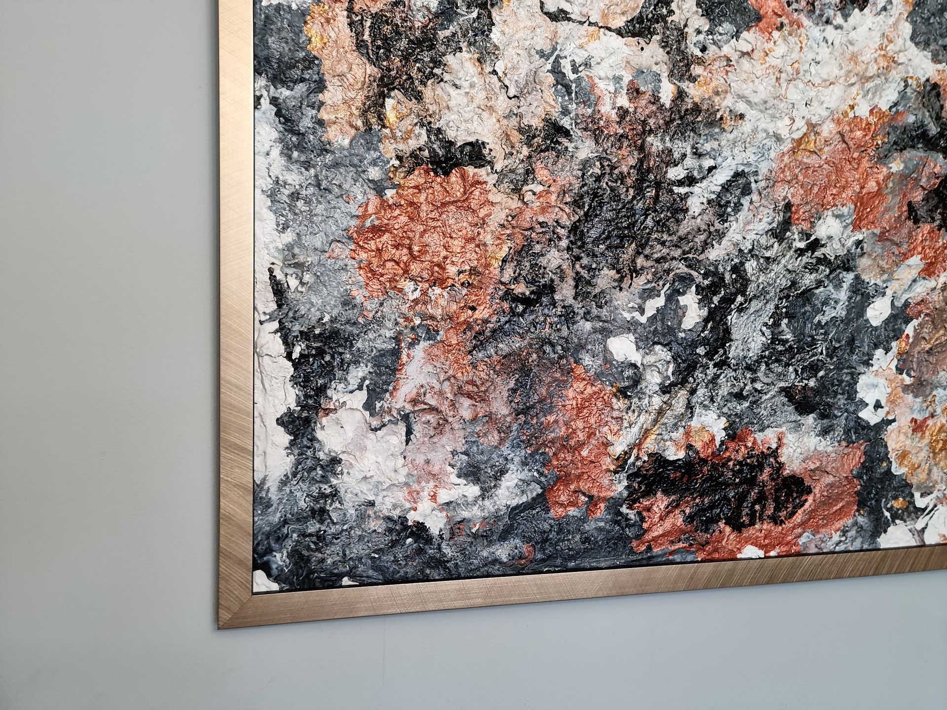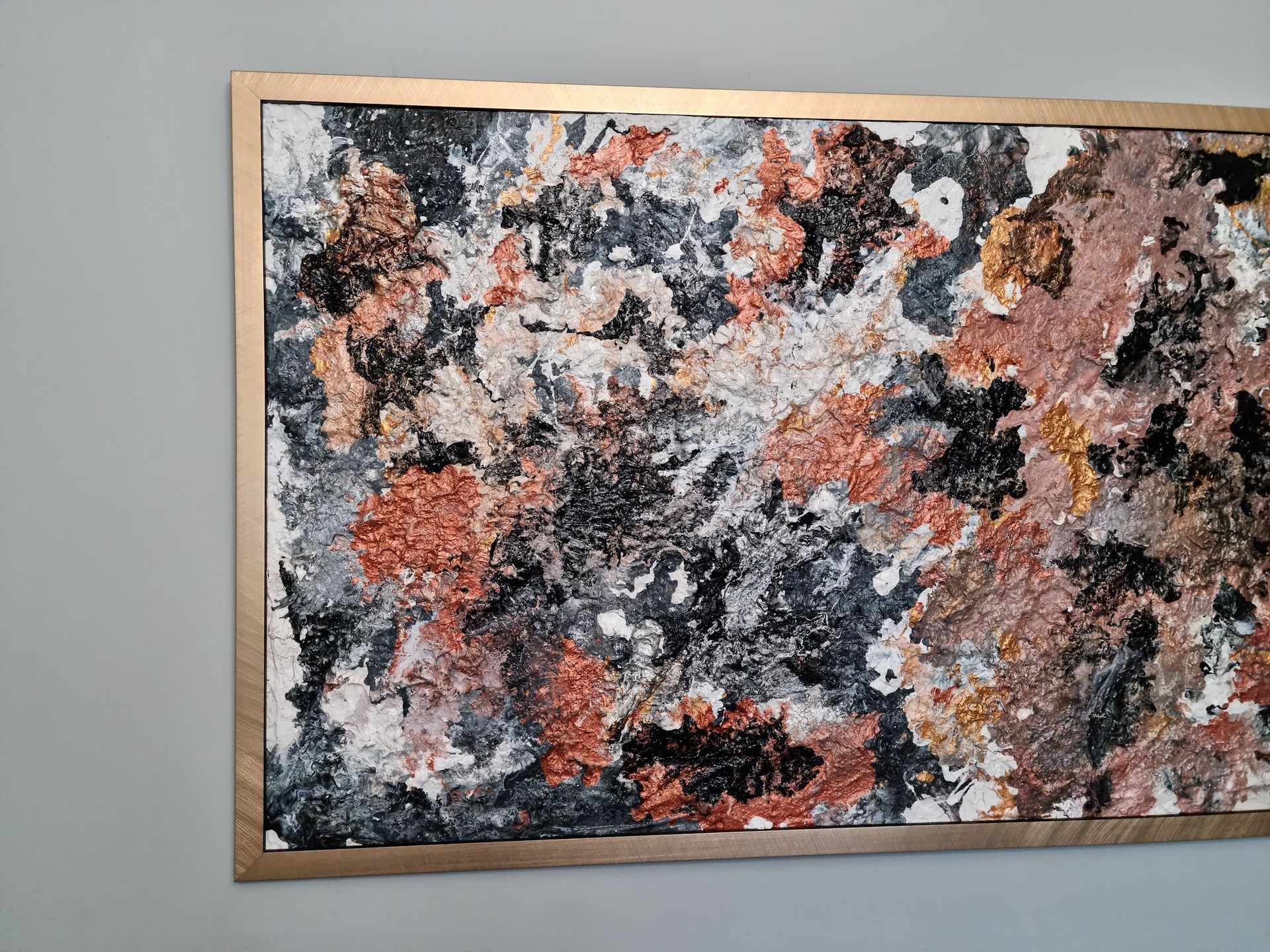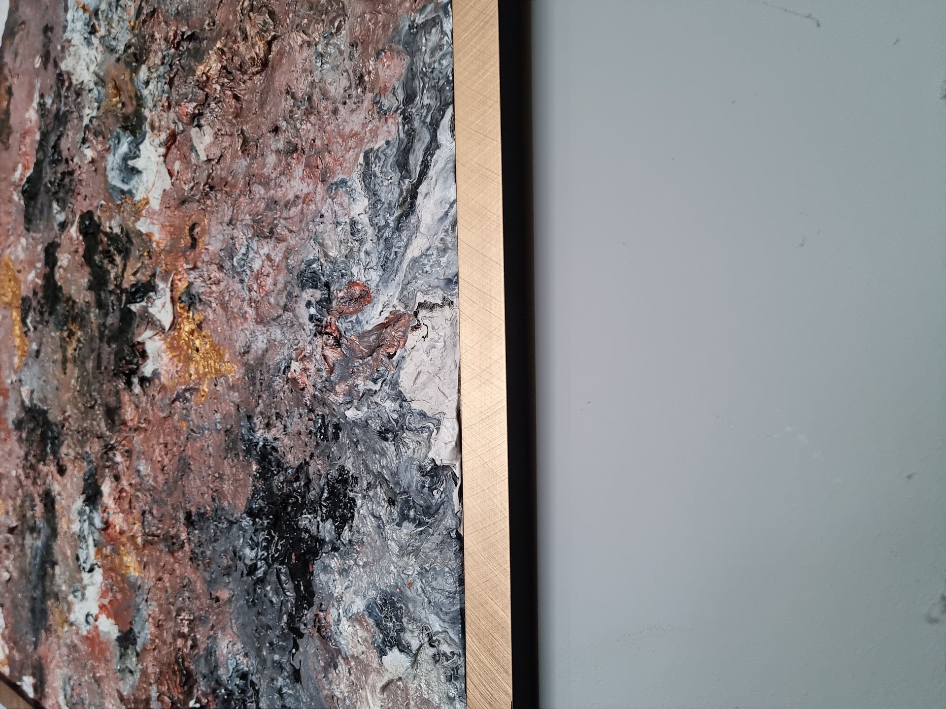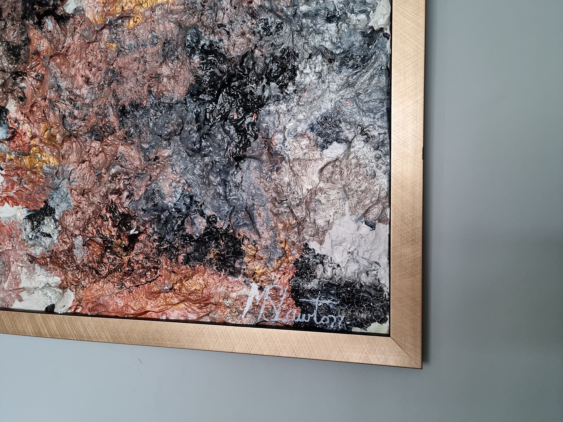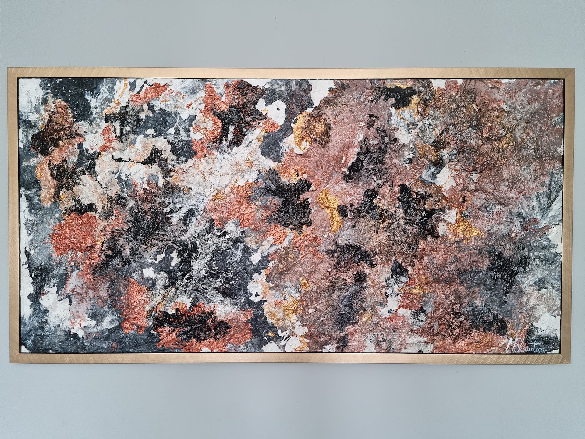 Set on a wooden board, Gold Mine has a thick contoured base layer of paint and plaster with top coats of gold, silver metallic paint on top of black, grey and white backdrop. Weight 10kg
