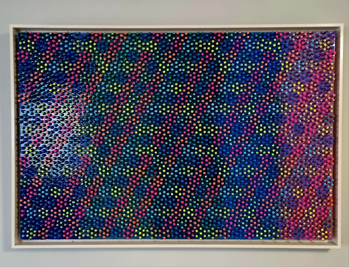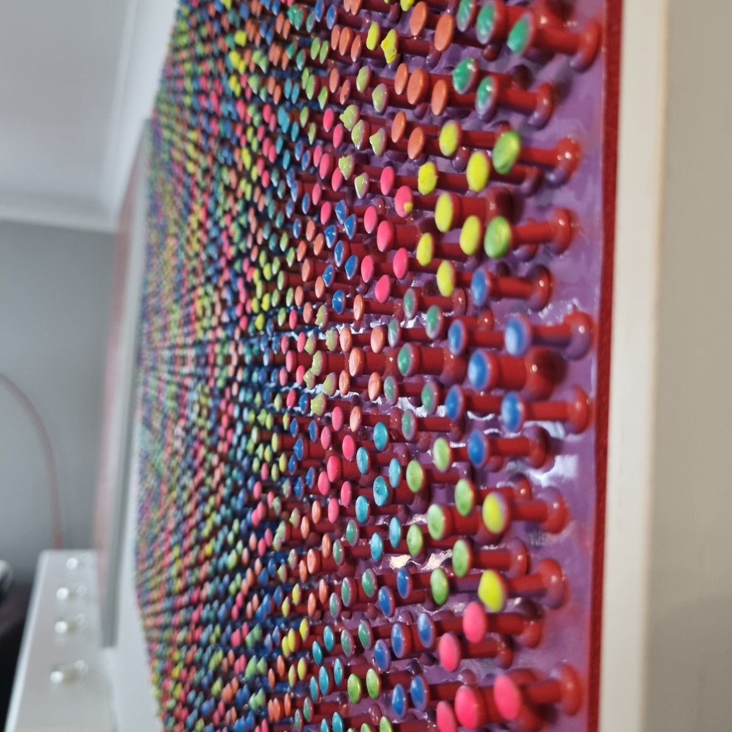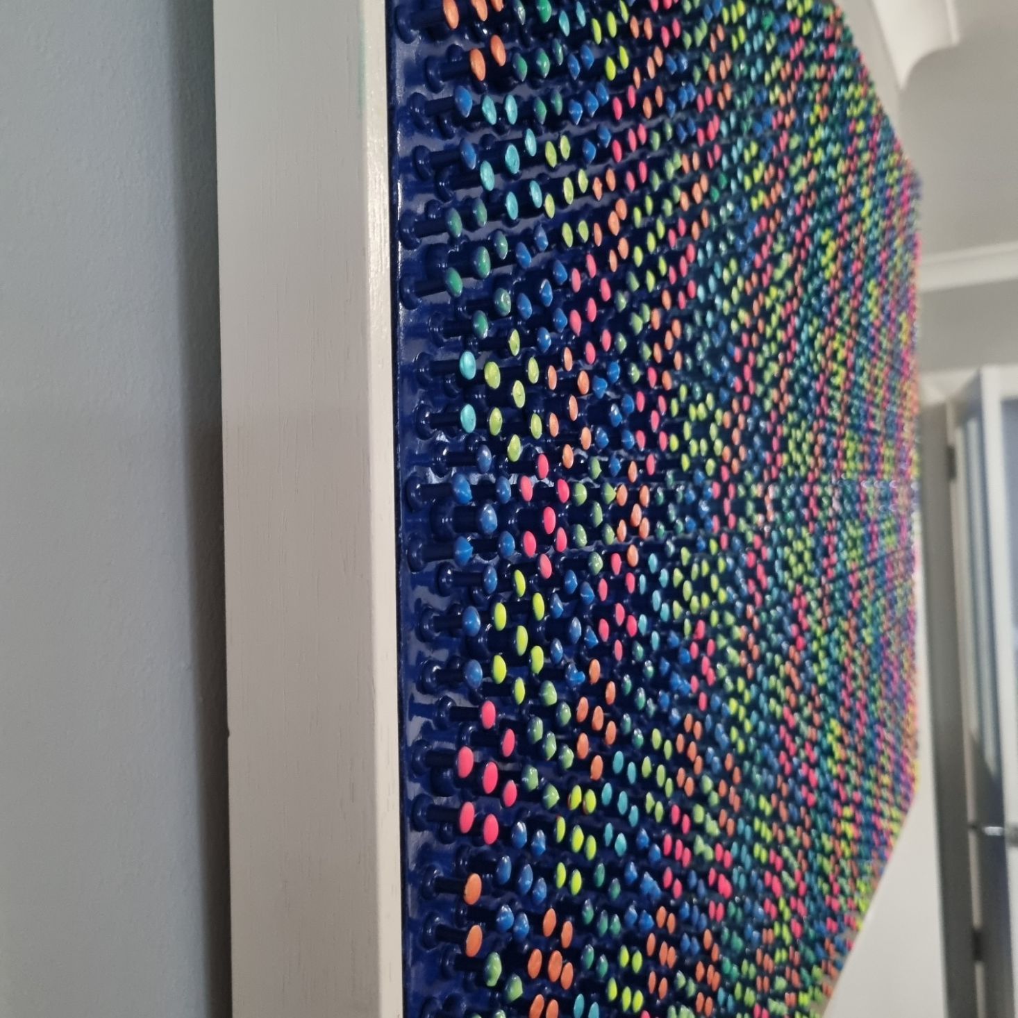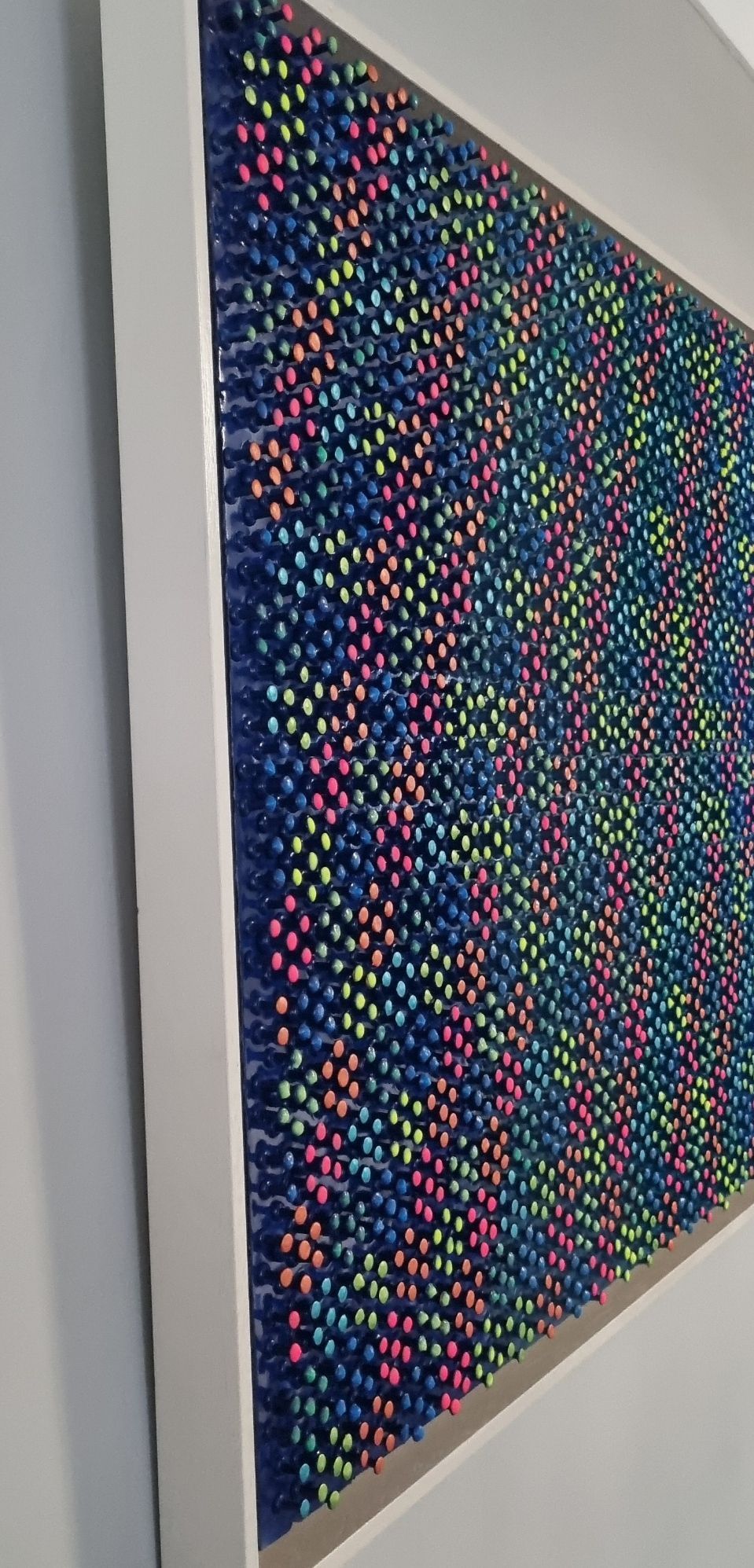 A 3D creation which changes colour when moving past. With a hexagonal honeycombe design.