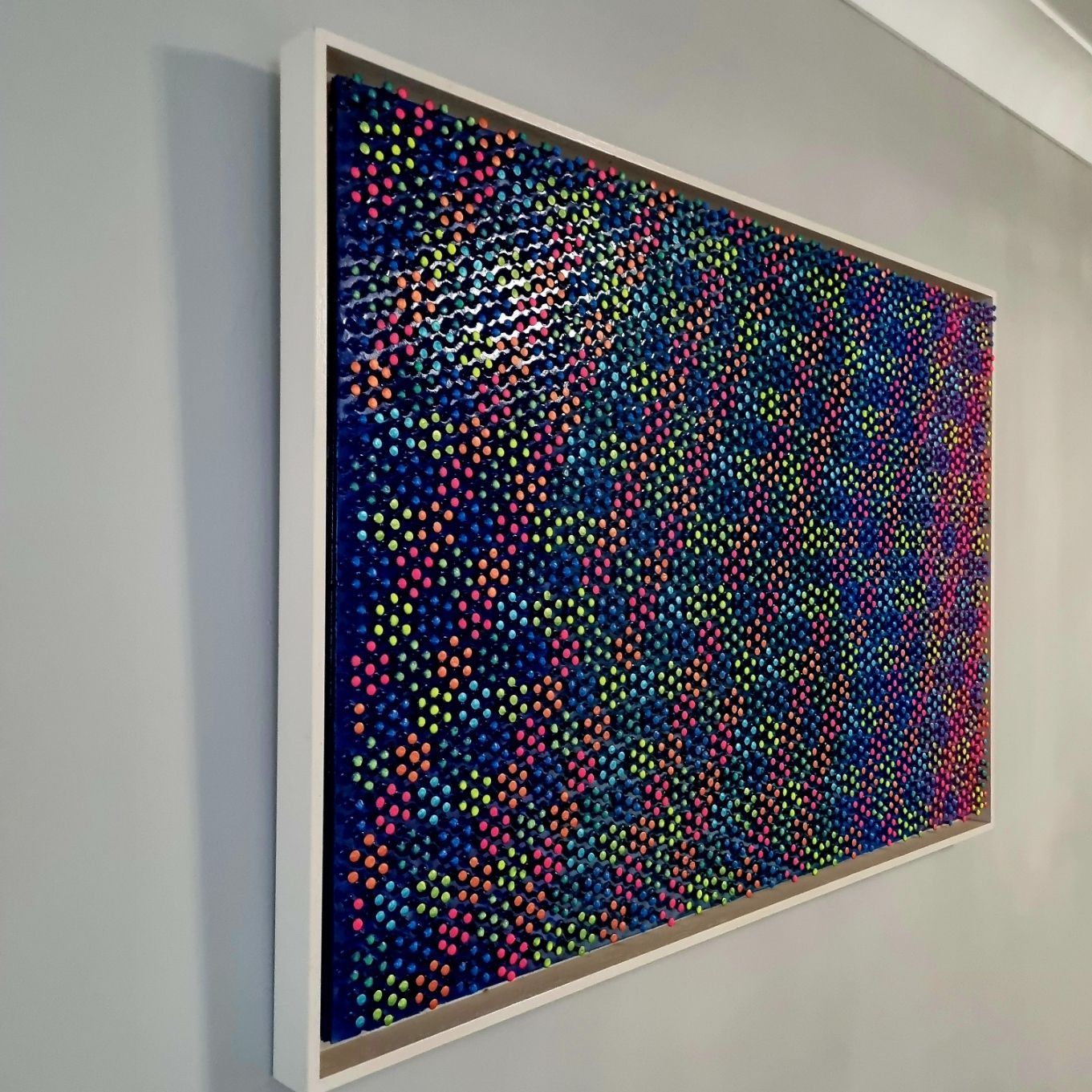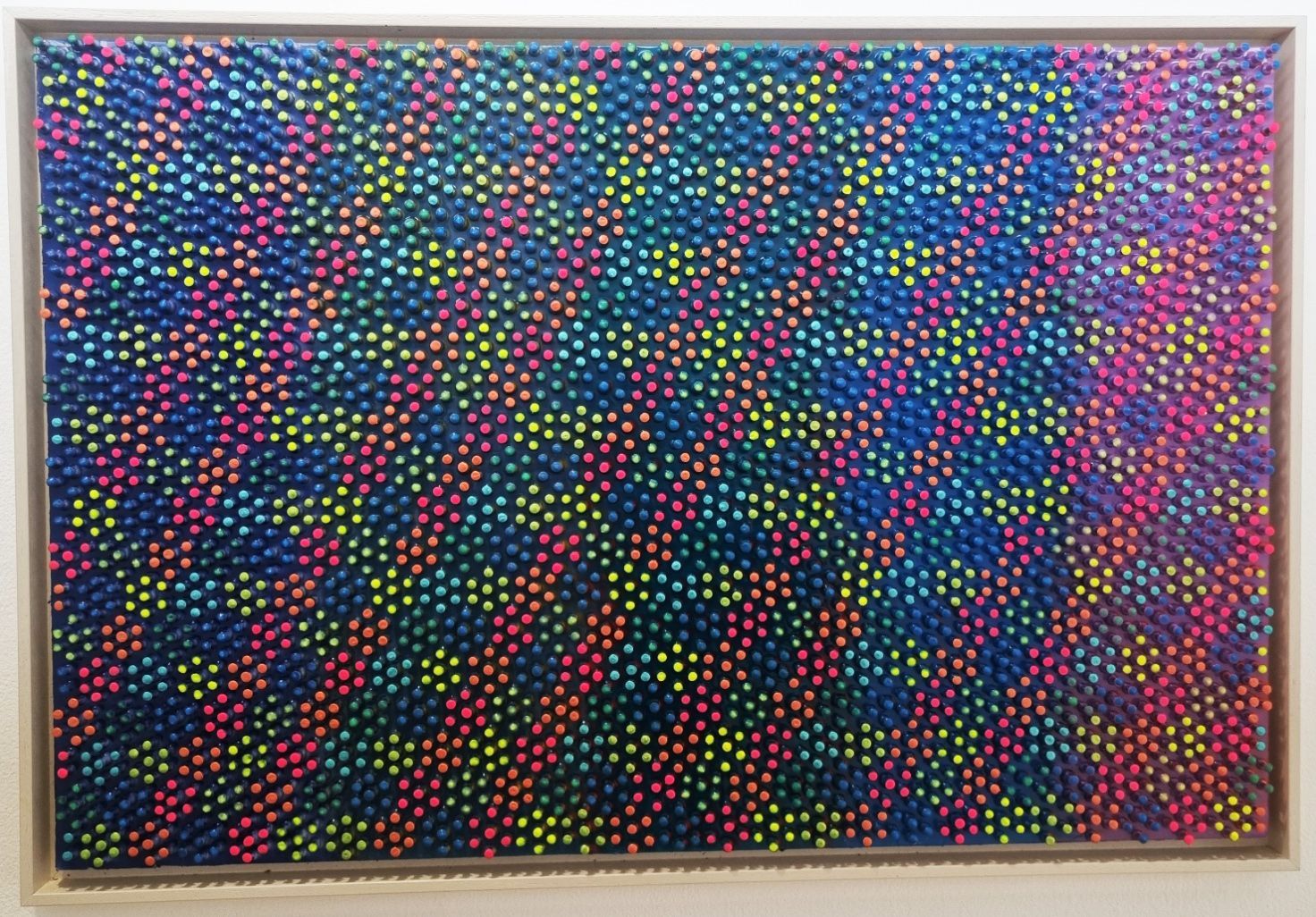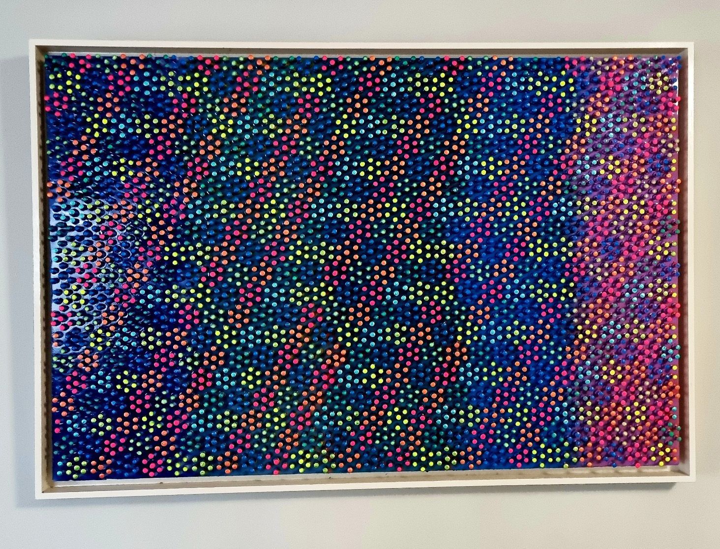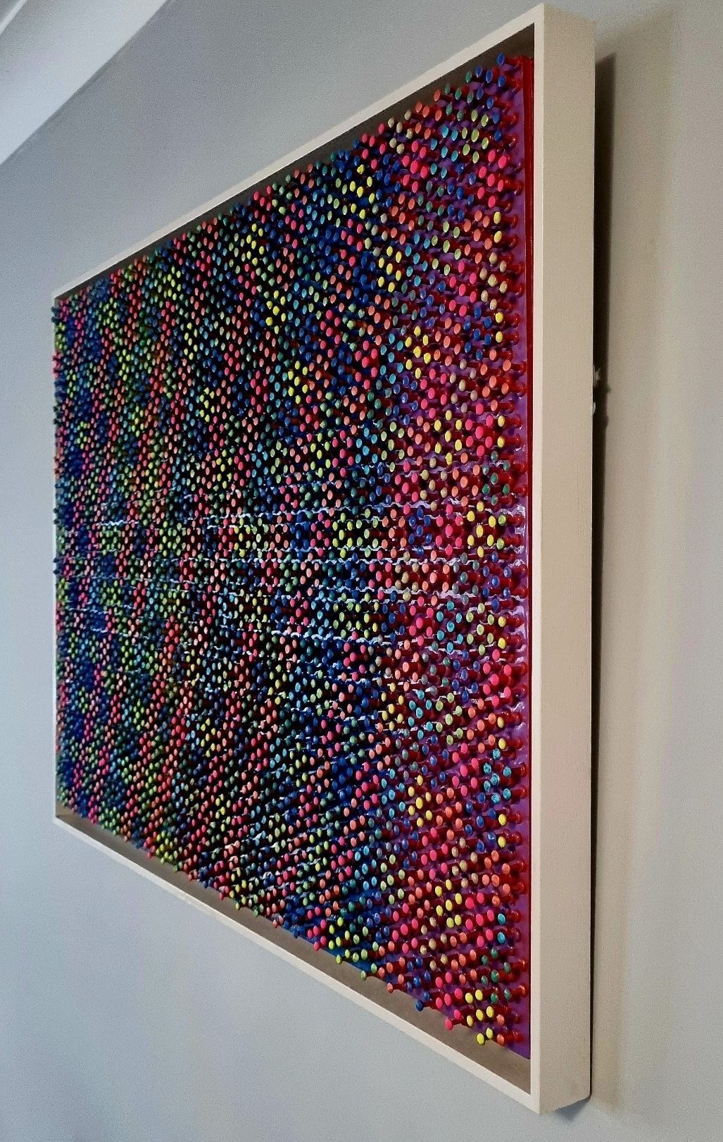 A 3D creation which changes colour when moving past. With a hexagonal honeycombe design.
