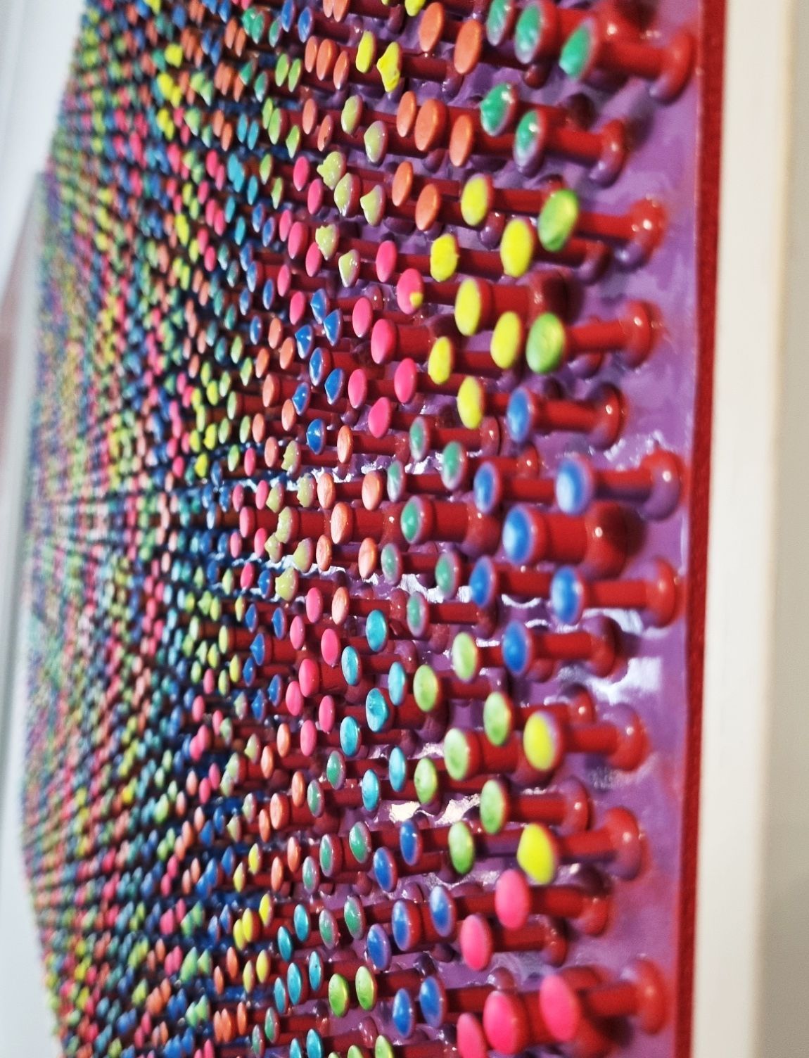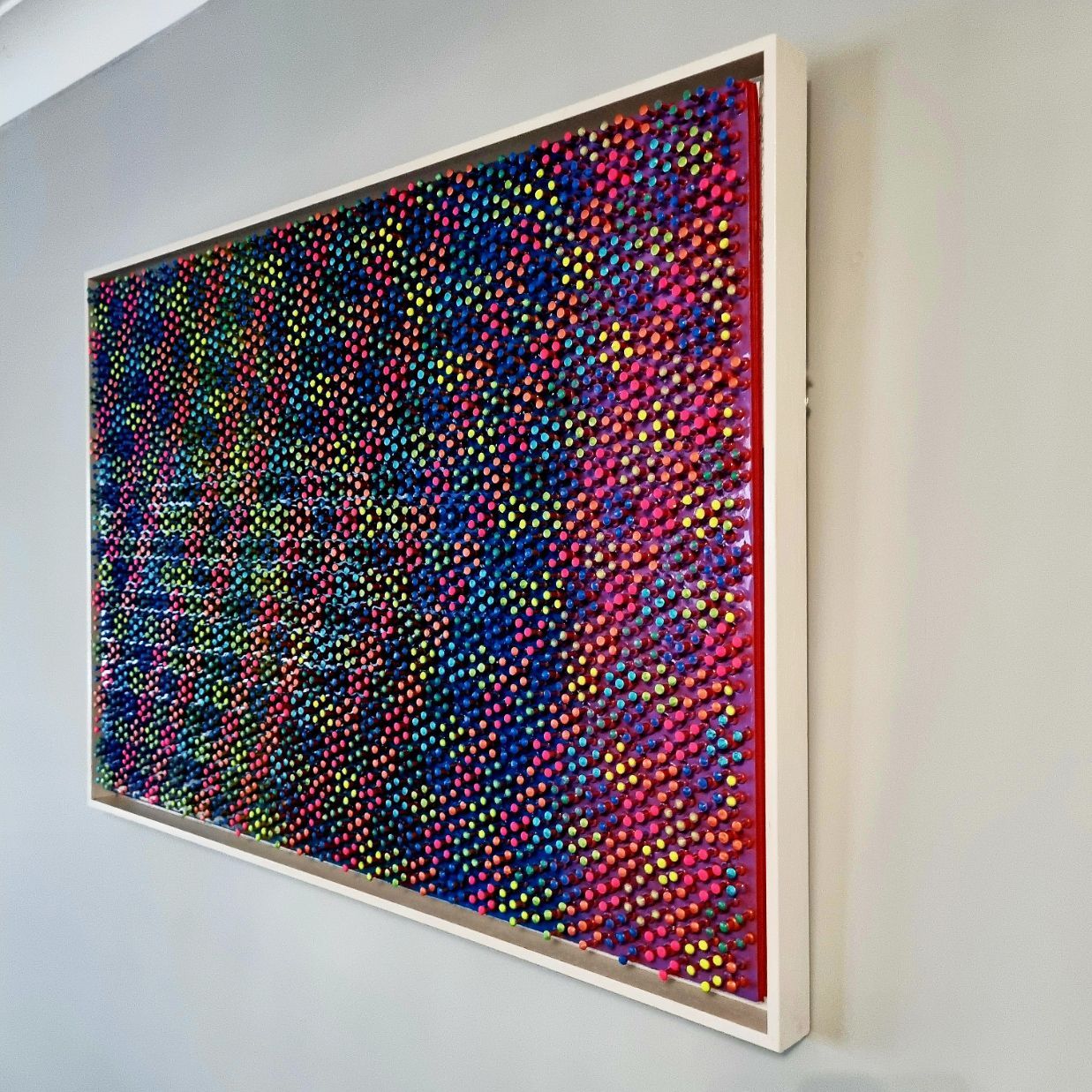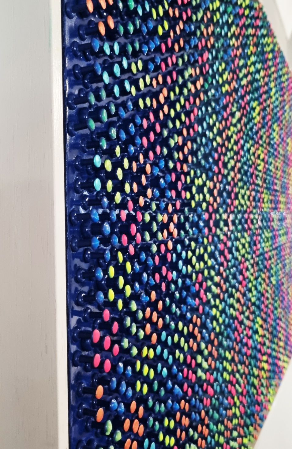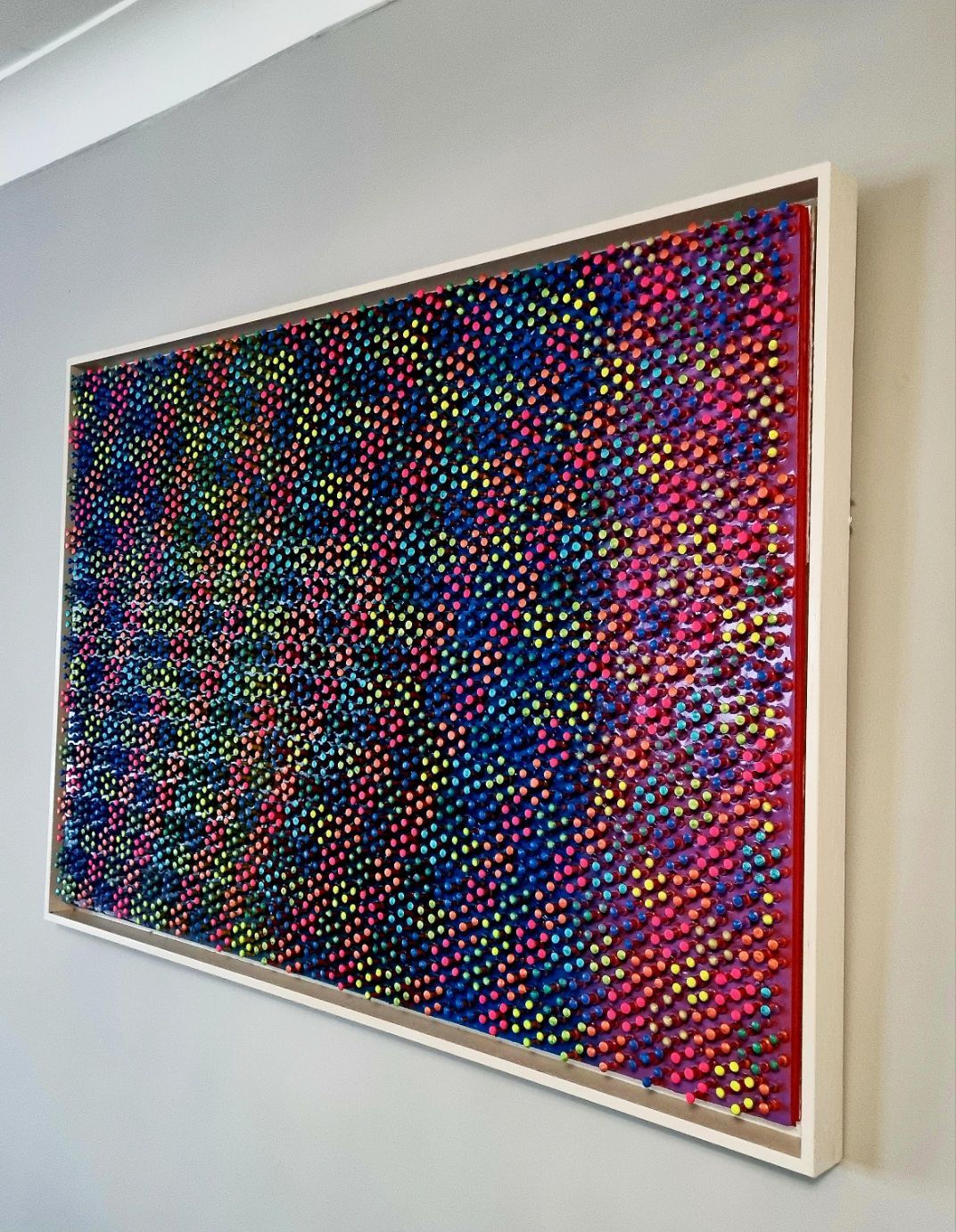 A 3D creation which changes colour when moving past. With a hexagonal honeycombe design.