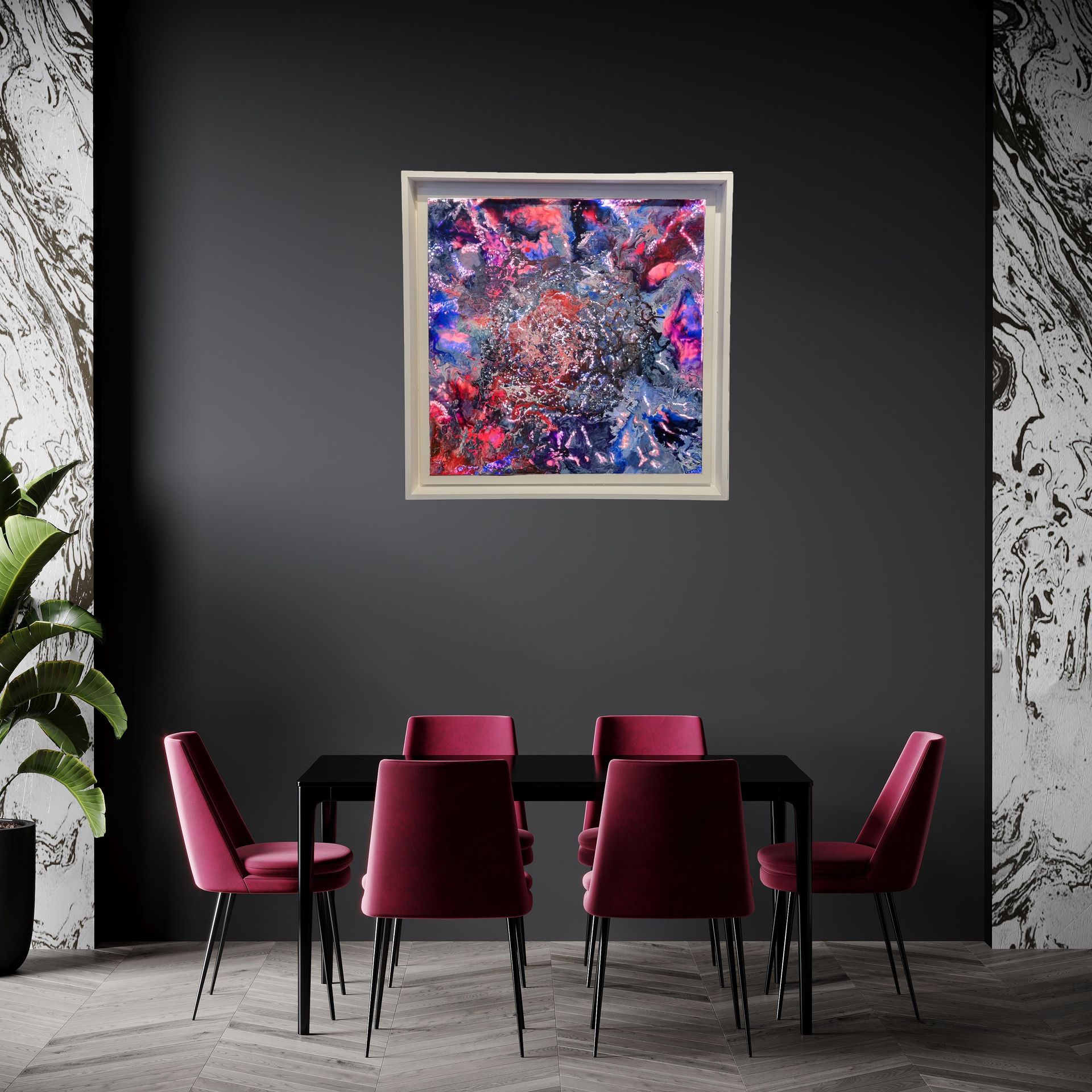 Please note this artwork requires a power point preferably concealed behind the piece to hide any wires.
