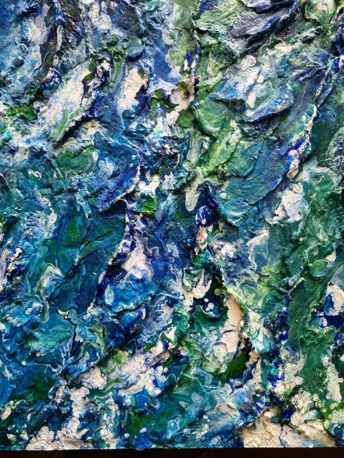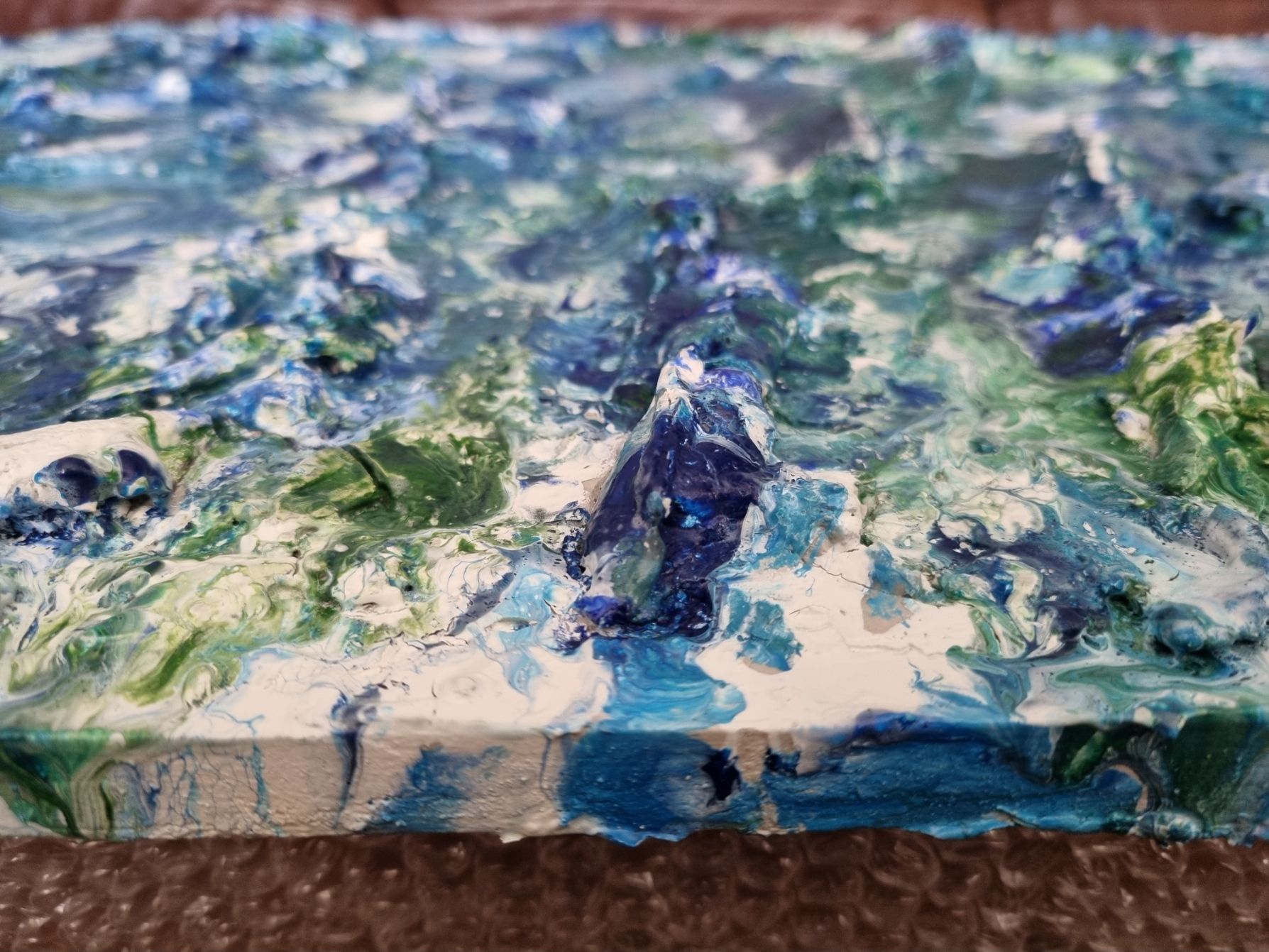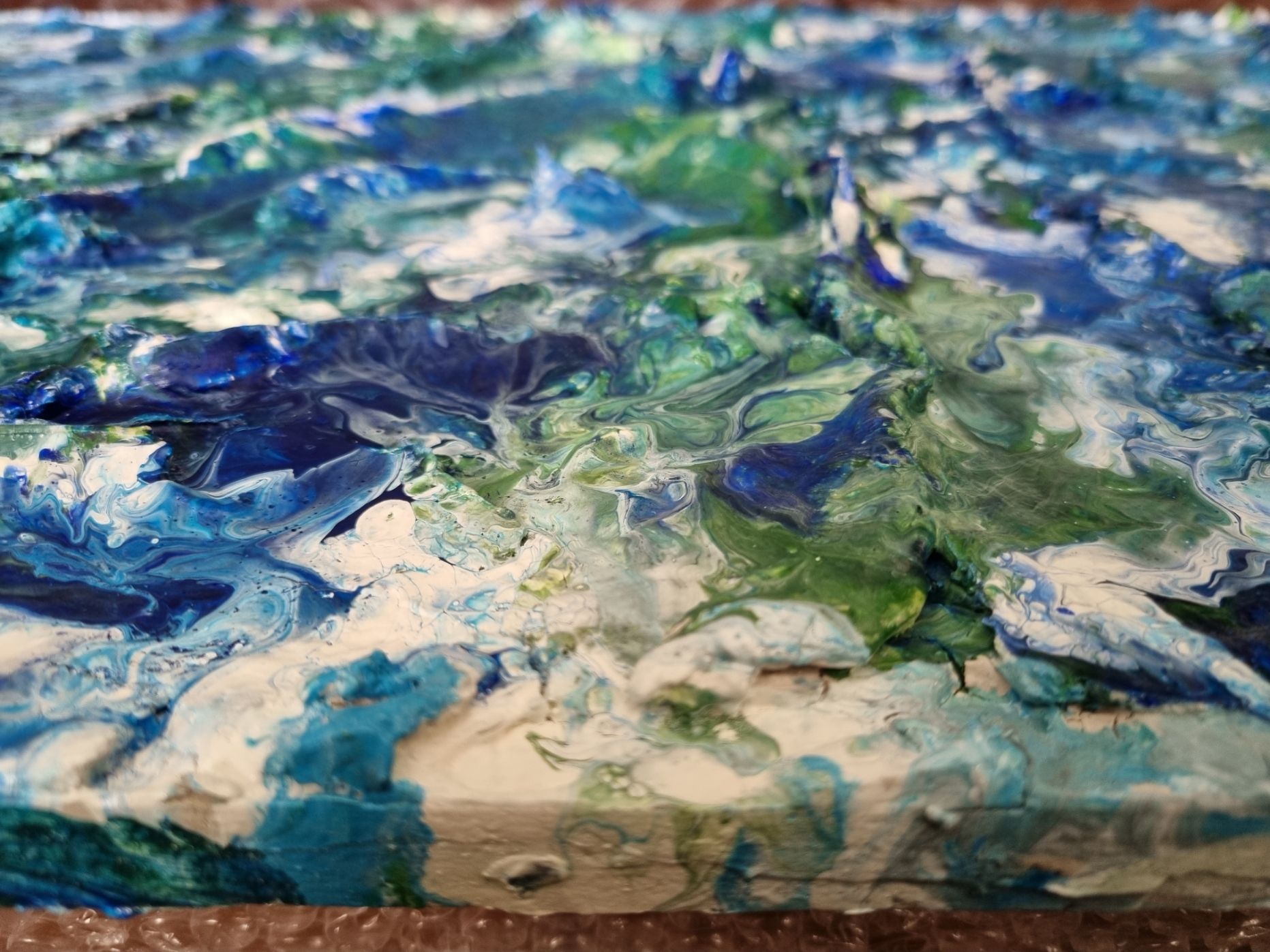 Ocean View is a multi layered art work. The base is a 12mm thick hardboard on top of which is a very thick layer of emulsion paint mixed in with cement to create a 3D wavey finish. The top coat is acrylic paint and a high gloss clear varnish finish. The size of the piece is 61cm x 120cm and the weight is quite heavy at 12kg. Solid wall fixings are place onto the back.