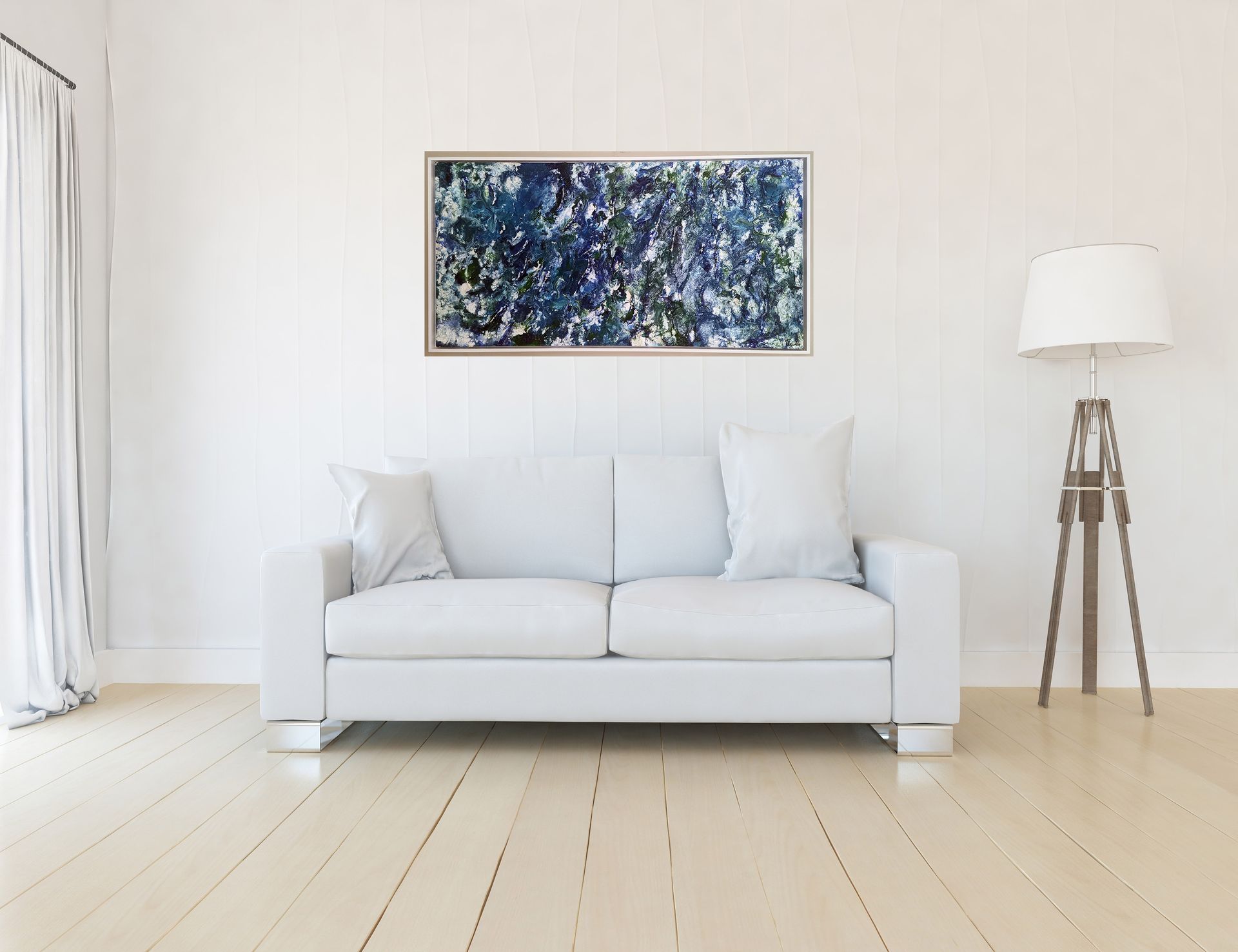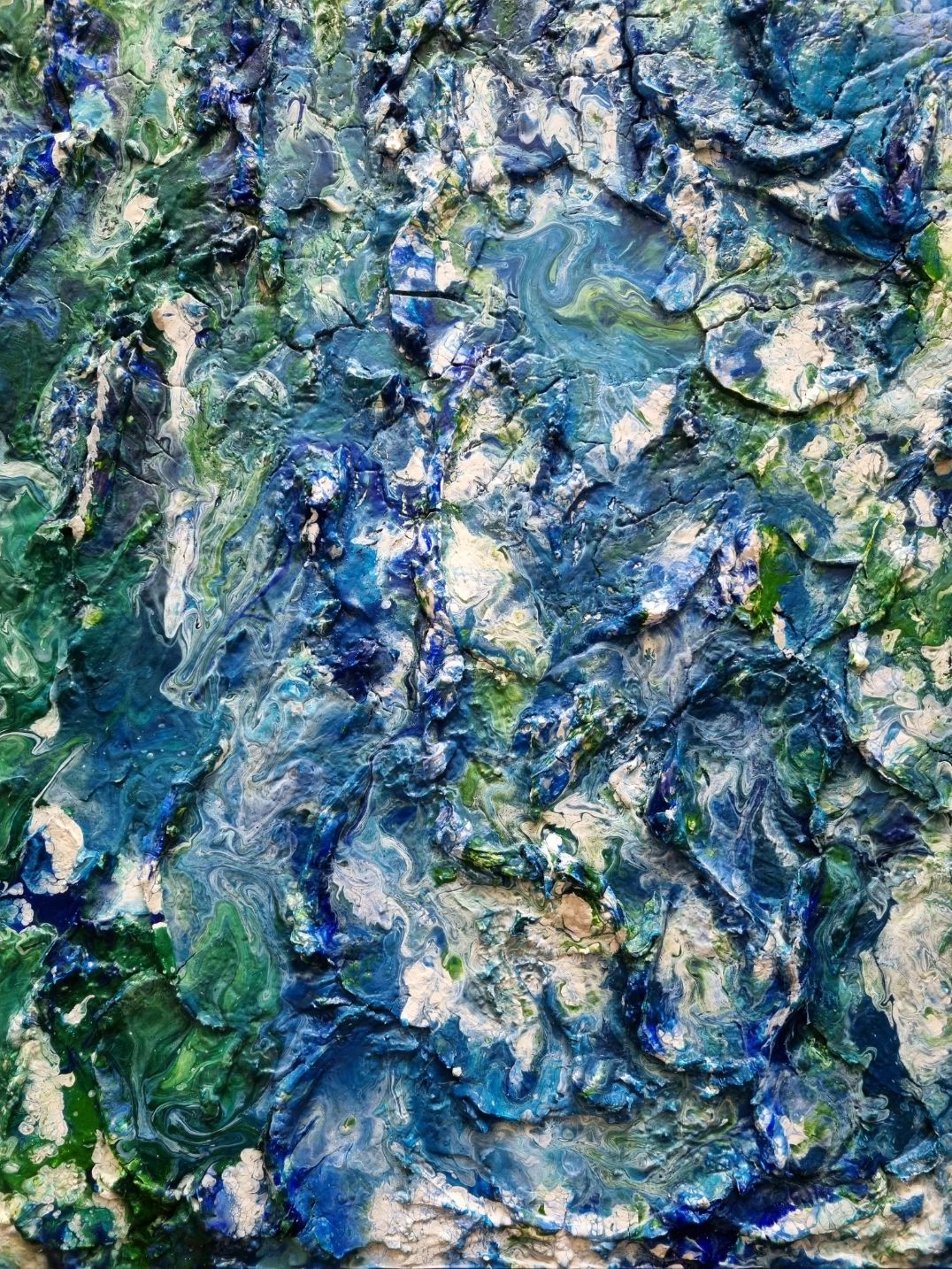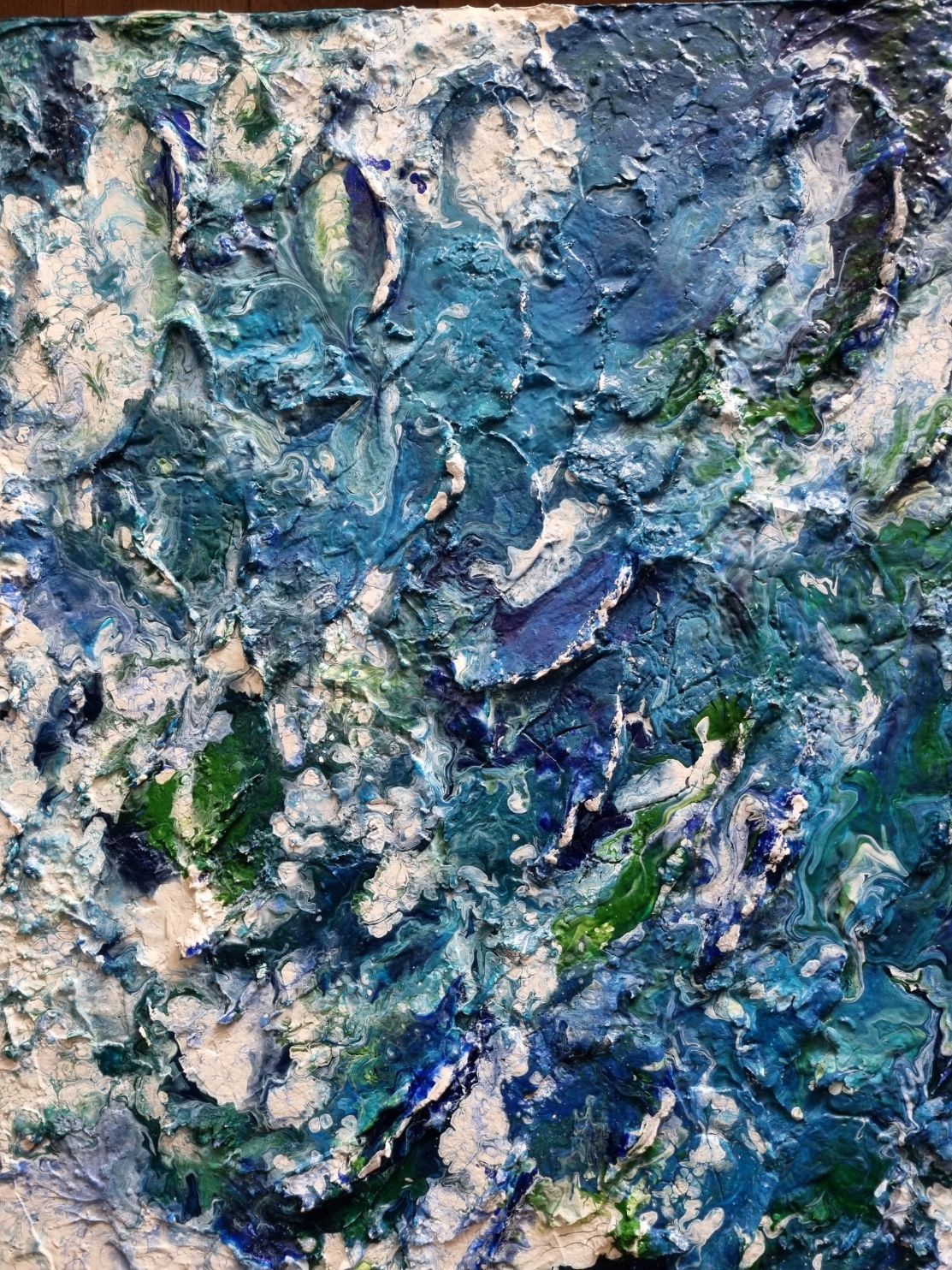 Ocean View is a multi layered art work. The base is a 12mm thick hardboard on top of which is a very thick layer of emulsion paint mixed in with cement to create a 3D wavey finish. The top coat is acrylic paint and a high gloss clear varnish finish. The size of the piece is 61cm x 120cm and the weight is quite heavy at 12kg. Solid wall fixings are place onto the back.