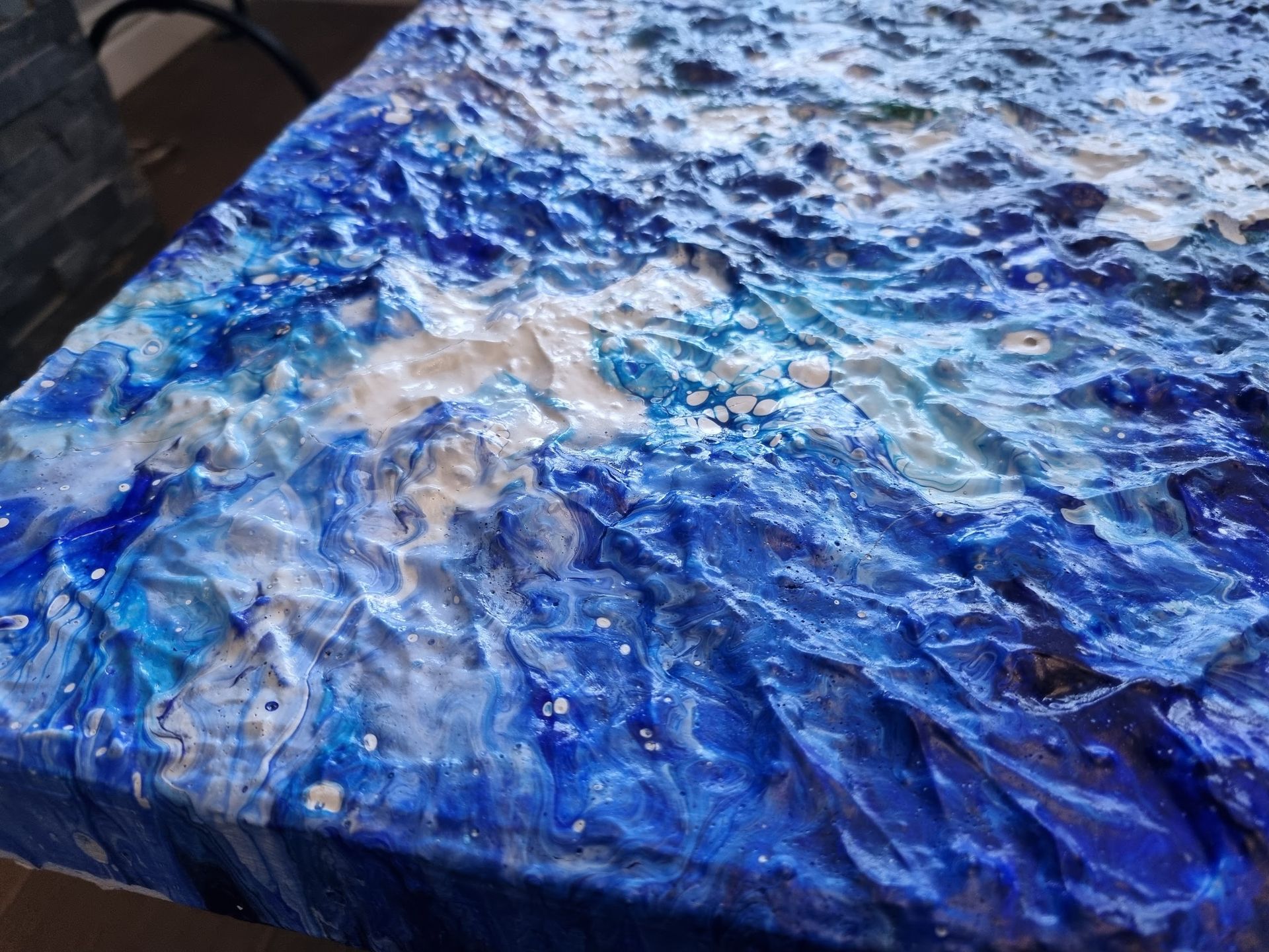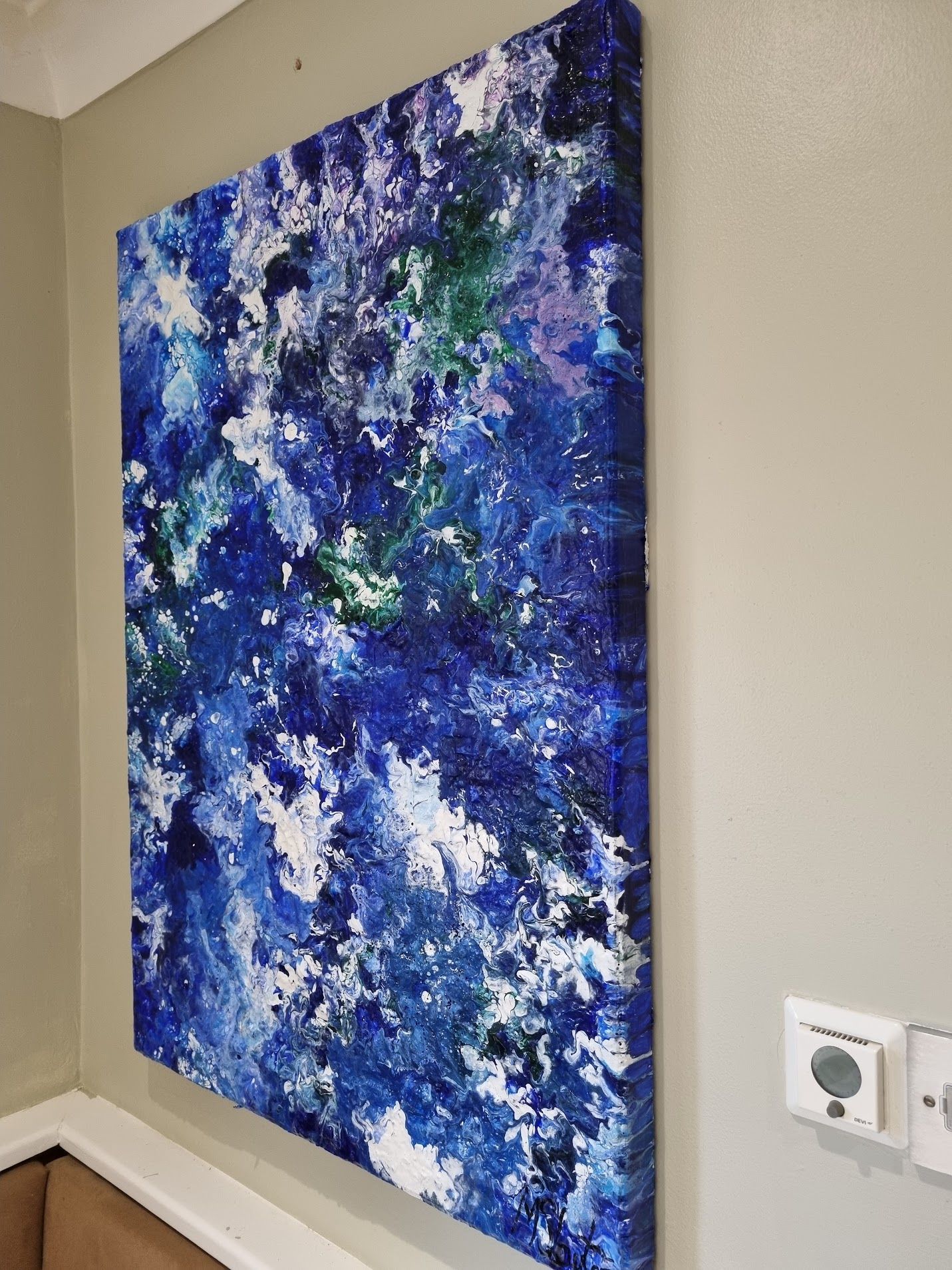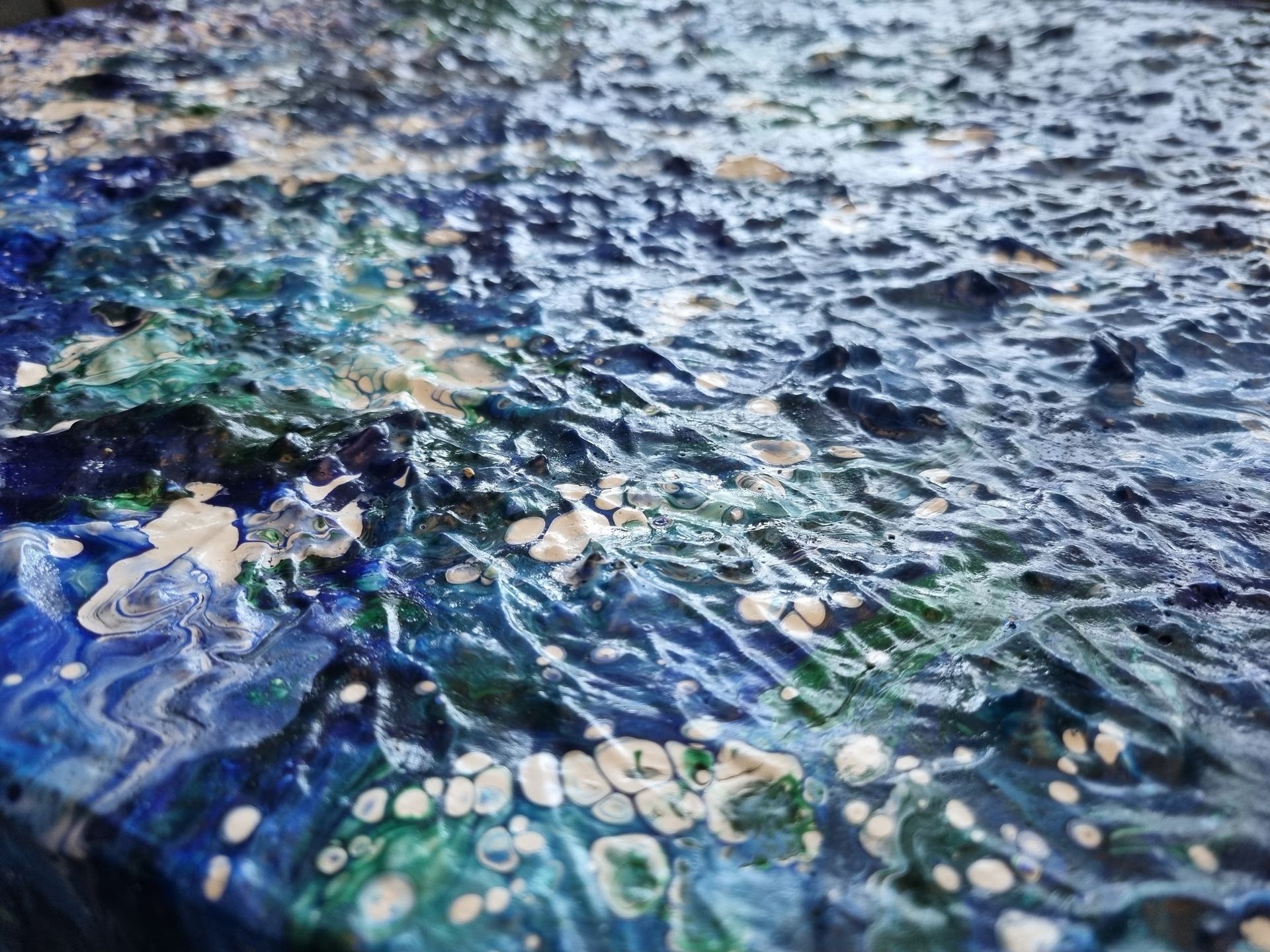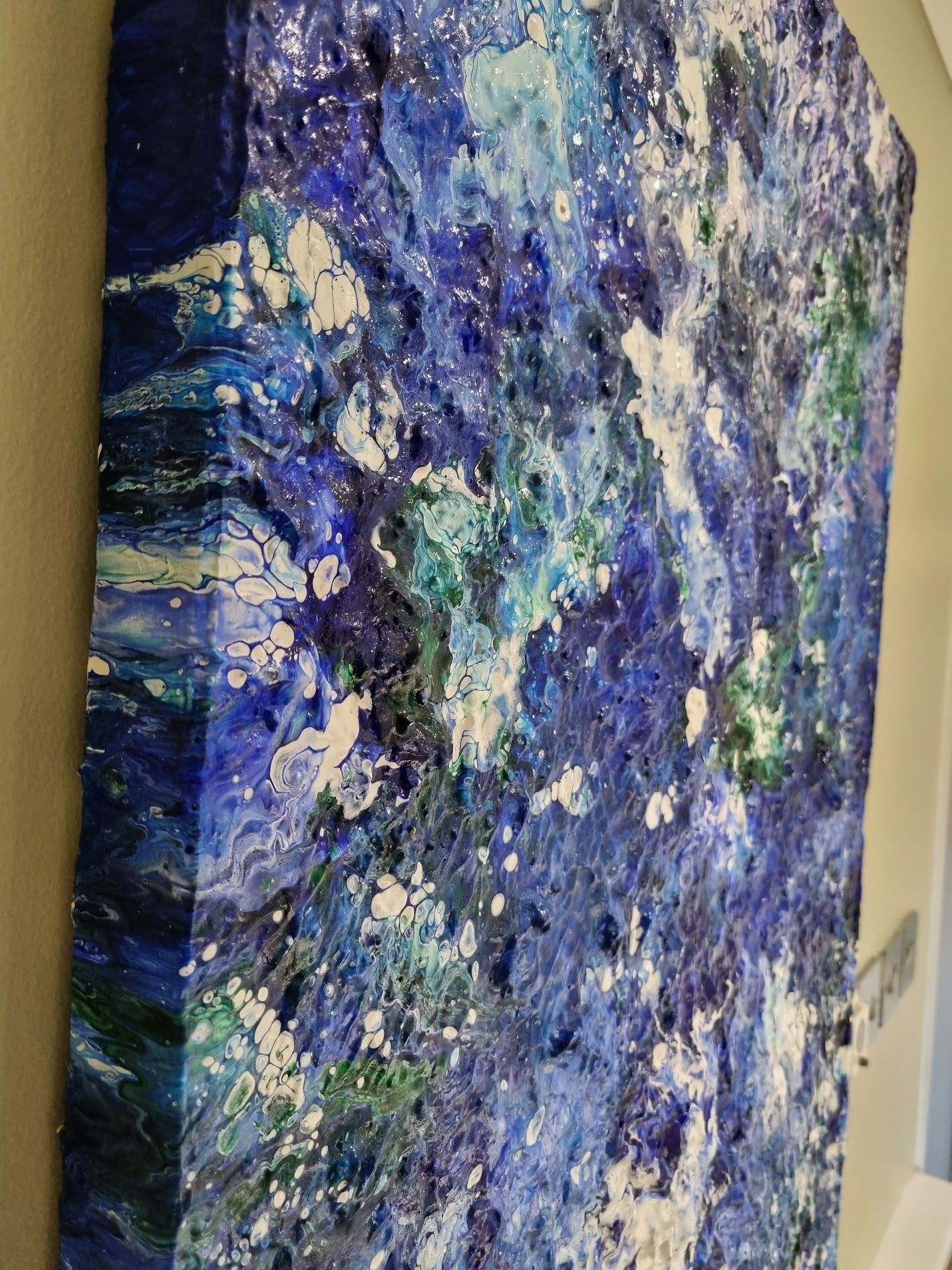 This is a very weighty piece with a think base layer of contoured plaster forming waves a ripples on top of which is many blue white green and purple layers to create a view of the planet from space.