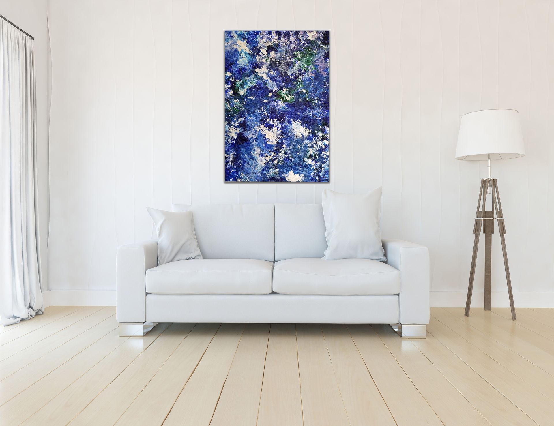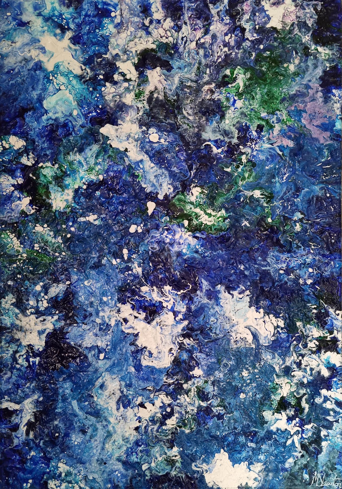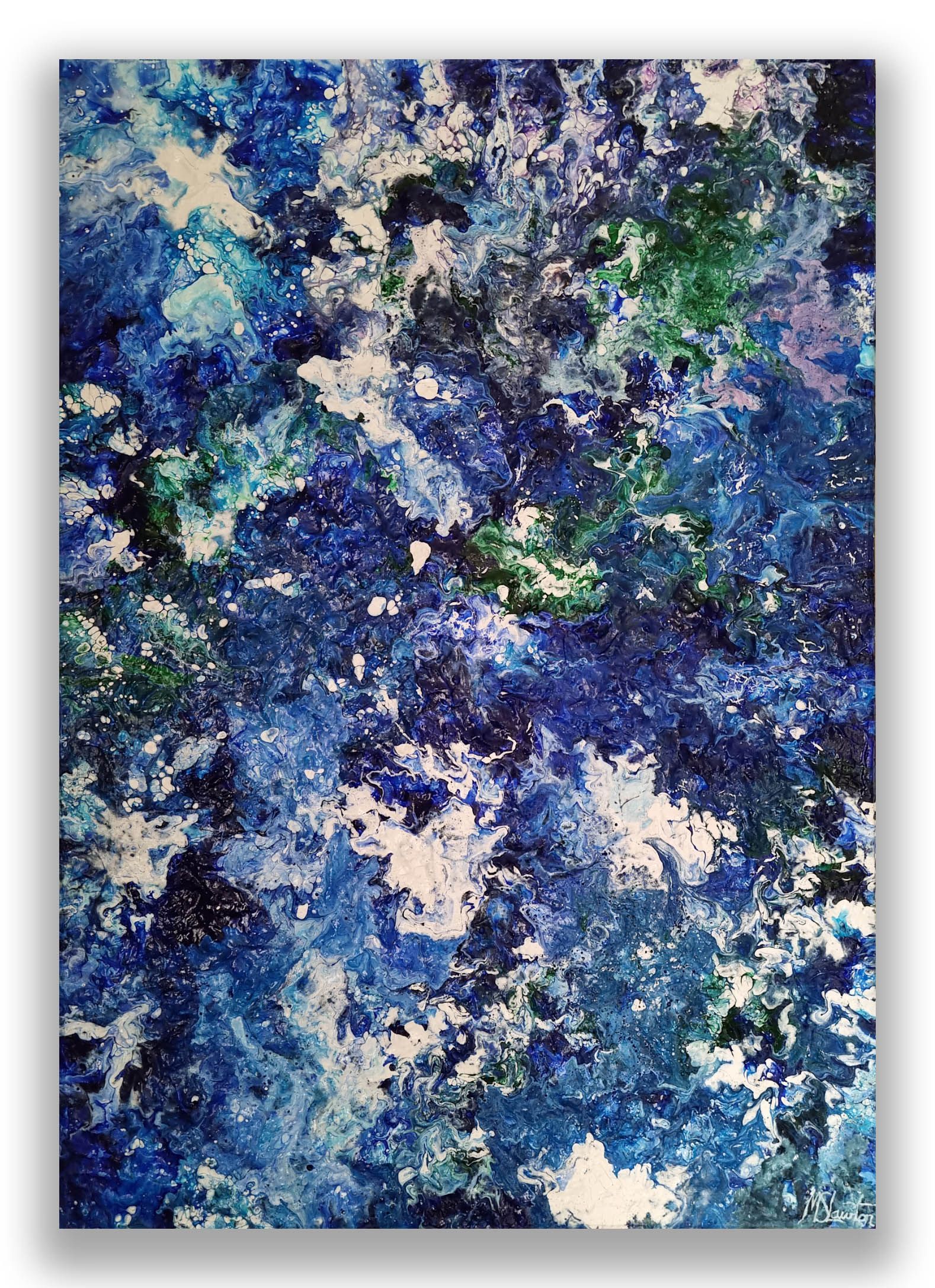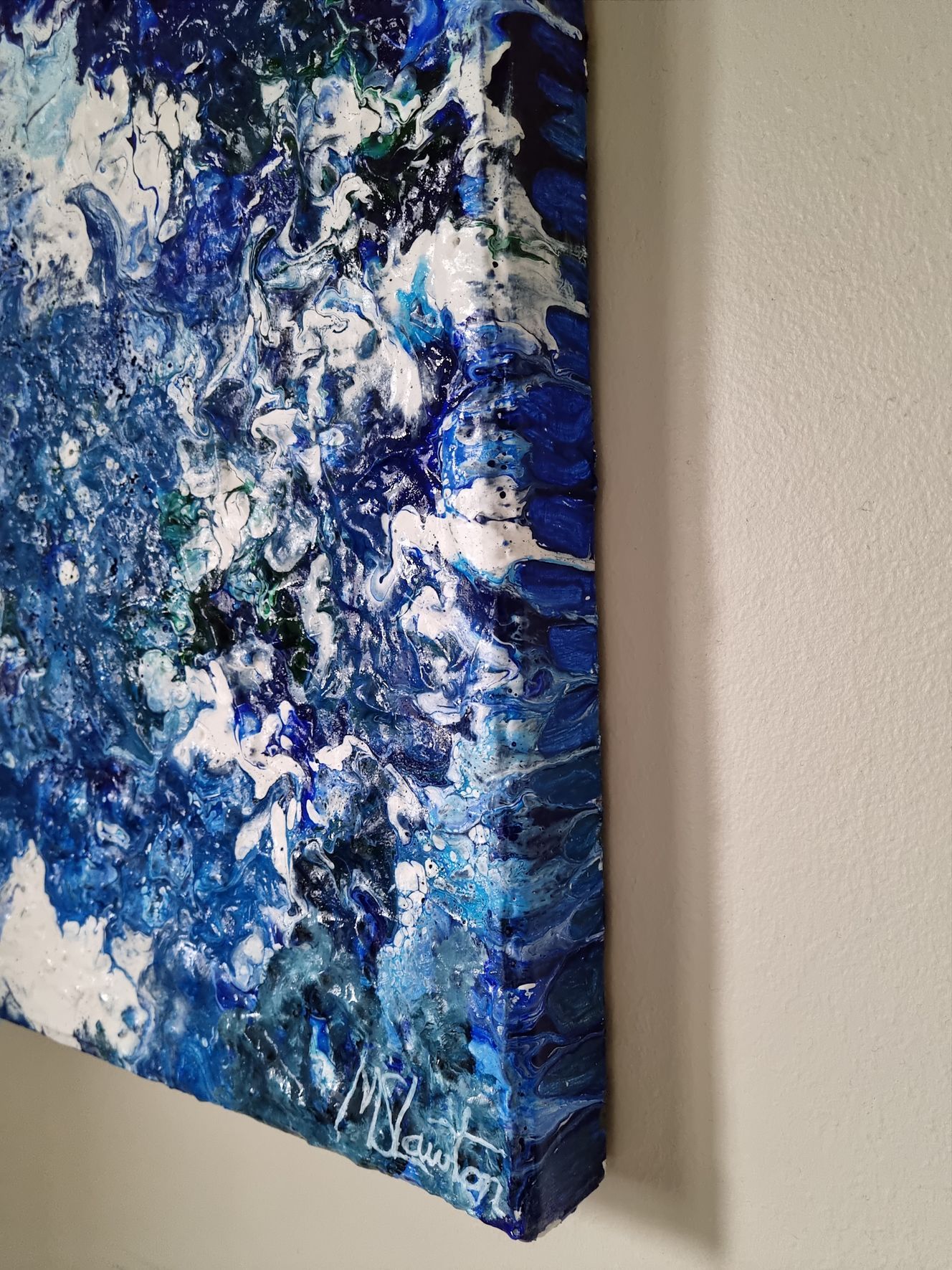 This is a very weighty piece with a think base layer of contoured plaster forming waves a ripples on top of which is many blue white green and purple layers to create a view of the planet from space.