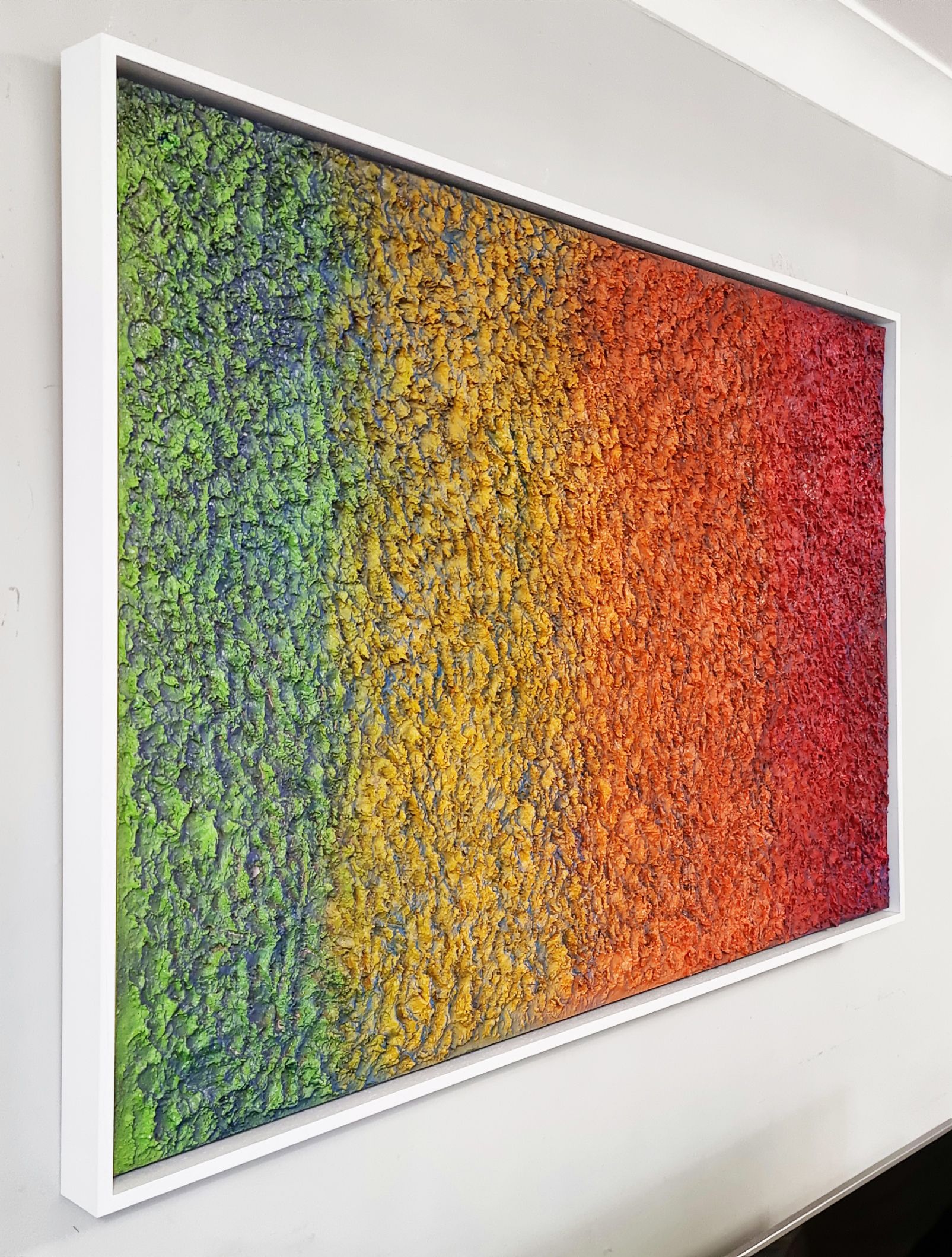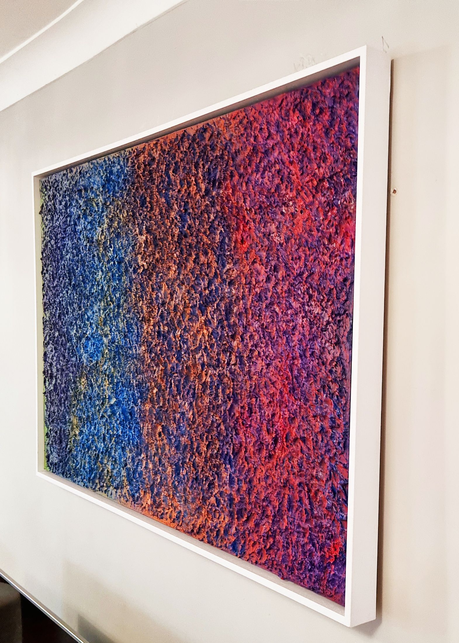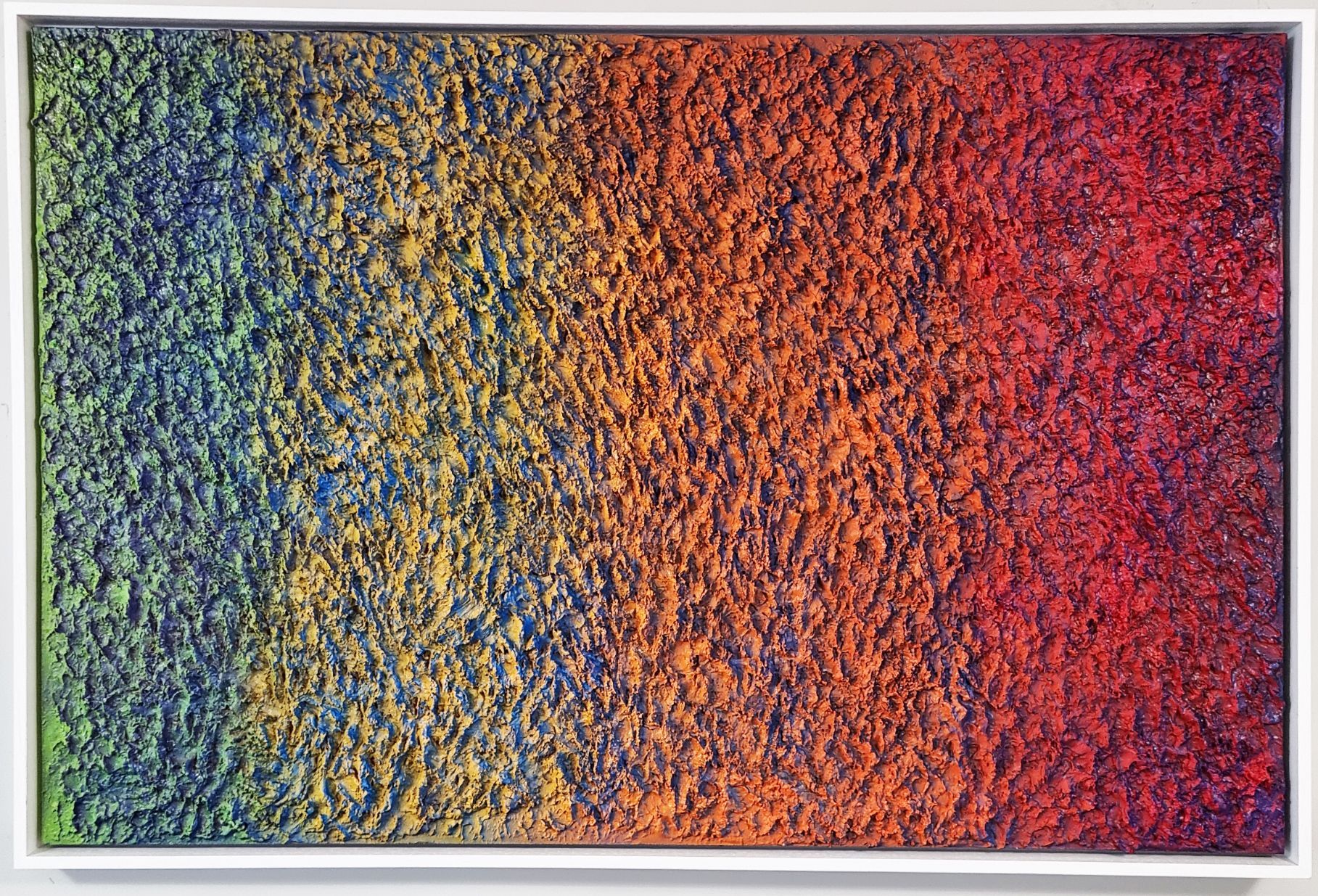 Spectrum is a heavily textured piece with deeply contoured base that forms a dramatic background on top of which the colours change from reds to blues from left to right. Overall weight 10kg.