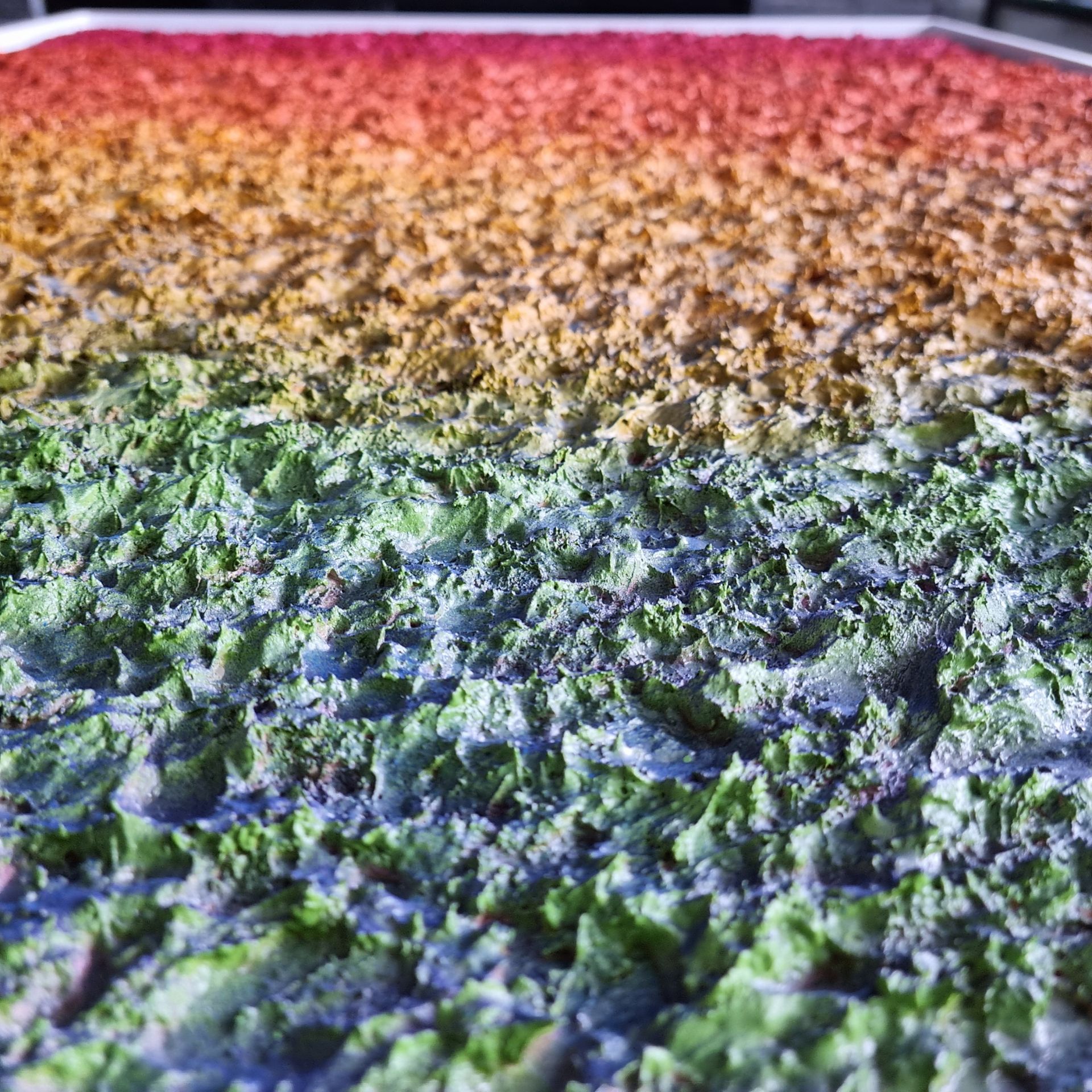 Immerse yourself in the vibrant world of Spectrum. This artwork is a captivating blend of colours, featuring rich greens and reds that create a mesmerizing visual experience. The textured surface adds depth and intrigue, making it a standout piece in any collection.